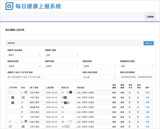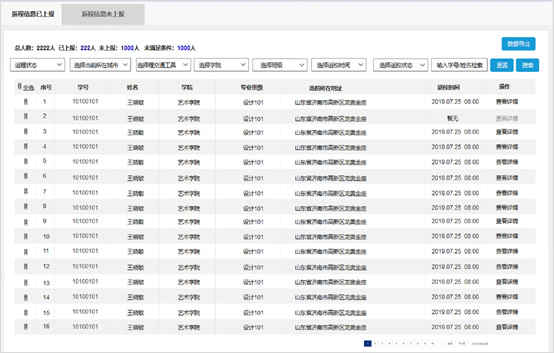 学生返校行程上报系统。收集学生拟定返校时间、地点、交通工具、航班、车次等行程大数据,便于学校安排返校批次,按系部、年级、地区精准控制。