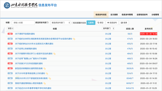 新冠疫情爆发以来,为做好疫情防控工作,我校迅速启用“智慧山水”APP,并联系供应商进行多项防疫功能开发,保证第一时间掌握师生健康情况,借助大数据分析技术,及时对疫情防控工作进行宣传、指导和部署。