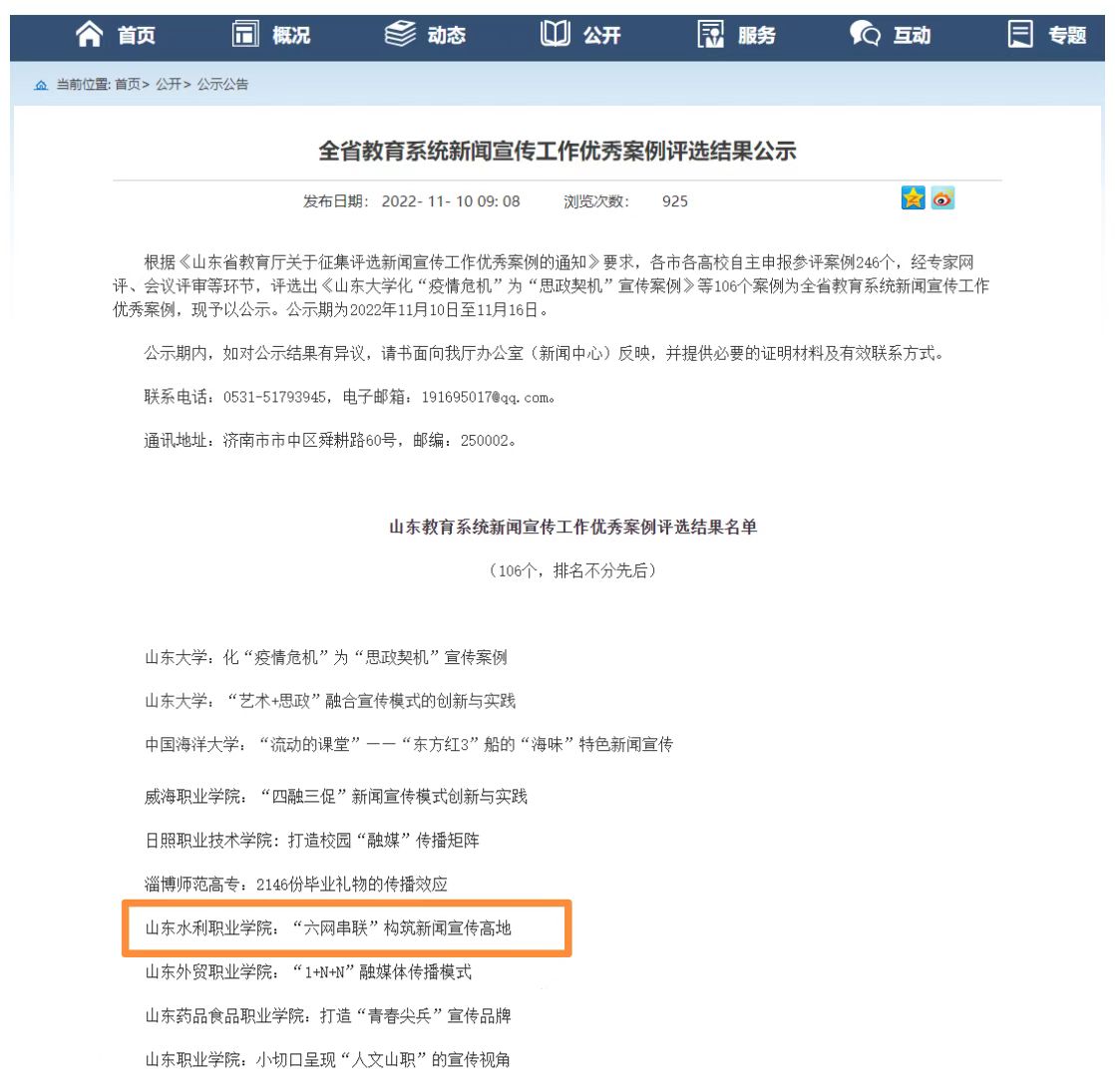 11月10日,省教育厅公示了山东教育系统新闻宣传工作优秀案例评选结果名单,我校报送的宣传案例《“六网串联”构筑新闻宣传高地》获评全省教育系统新闻宣传工作优秀案例。