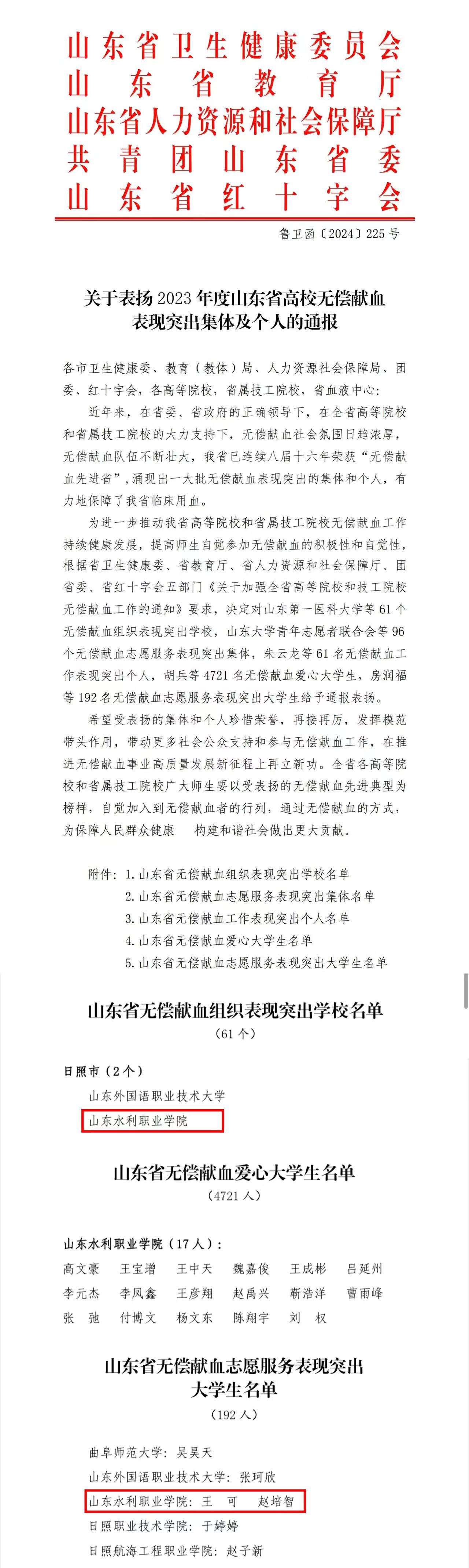 近日,山东省卫生健康委、省教育厅、省人社厅、共青团省委、省红十字会五部门联合下发《关于表扬2023年度山东省高校无偿献血表现突出集体及个人的通报》,学院获评“山东省无偿献血组织表现突出学校”荣誉称号,高文豪等17人获“山东省无偿献血爱心大学生”、王可等2人获“山东省无偿献血志愿服务表现突出大学生”荣誉称号。