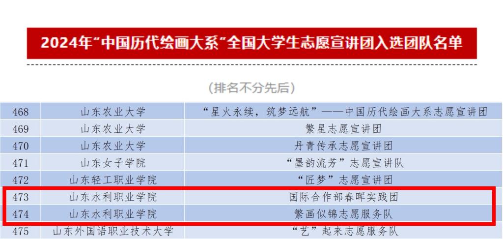 近日,团中央青年志愿者行动指导中心发布了2024年“中国历代绘画大系”全国大学生志愿宣讲团入选团队名单,学院国际合作部“春晖实践团”、水利工程系“繁画似锦志愿服务队”成功入选。