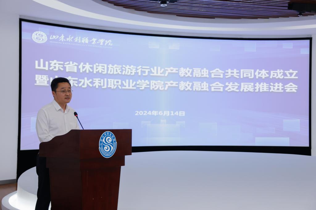 王维代表学院党委及全院师生向出席会议的领导嘉宾表示欢迎。他指出,山东省休闲旅游行业产教融合共同体是在学院2024年携手日照高新区、泰盈科技集团联合成立的市域产教联合体基础上,牵头成立的又一个政行企校合作共赢发展的高端平台。共同体的成立旨在深入学习贯彻习近平总书记关于建设旅游强国的重要指示和关于旅游发展的系列重要论述,进一步整合休闲旅游行业的优质资源,打造全行业、跨区域、多元融通的产教融合新模式,为山东省休闲旅游产业的持续健康发展提供强有力的支撑。王维强调,学院将充分发挥政府统筹、产业聚合、企业牵引、学校主体的联动机制作用,推动教育链、人才链、产业链、创新链有机衔接,构建校企合作产教融合的高质量发展新生态。要做深做实休闲旅游行业产教融合共同体,赋能文旅新质生产力;要深度推进校企合作,实现产教融合高质量发展;要深学细悟习近平总书记重要讲话精神,共谱“城市+大学”融合发展新篇章。