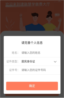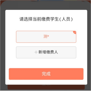 4、首次登录时,自动跳出信息维护界面,依次维护个人信息、缴费学生(人员)信息,录入姓名、身份证号(身份证号最后一位是X的,请大写)。并选择确认要进行缴费的学生,点击完成。