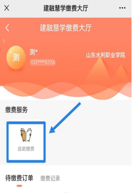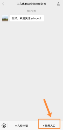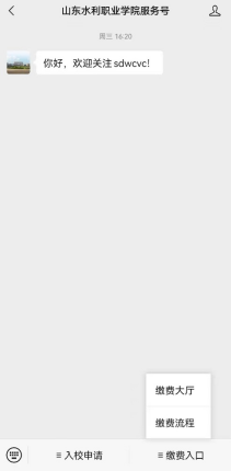 2、进入山东水利职业学院服务号,点击右下角“缴费入口”,选择“缴费大厅”可进行缴费,选择“缴费流程”可查看缴费流程说明。