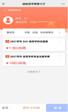 5、点击选择【自助缴费】进入缴费界面,根据自身的实际情况,可选择全部项目进行一次性缴费,也可逐个或部分选择项目进行缴费。