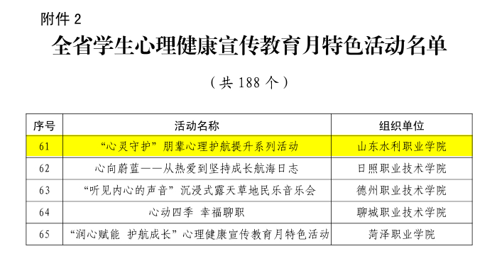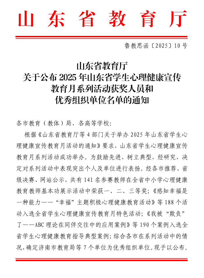 近日,山东省教育厅公布2025年山东省学生心理健康宣传教育月展示活动获奖名单,学院报送的“心理健康宣传教育月特色活动”和“心理健康教育指导典型案例”榜上有名。