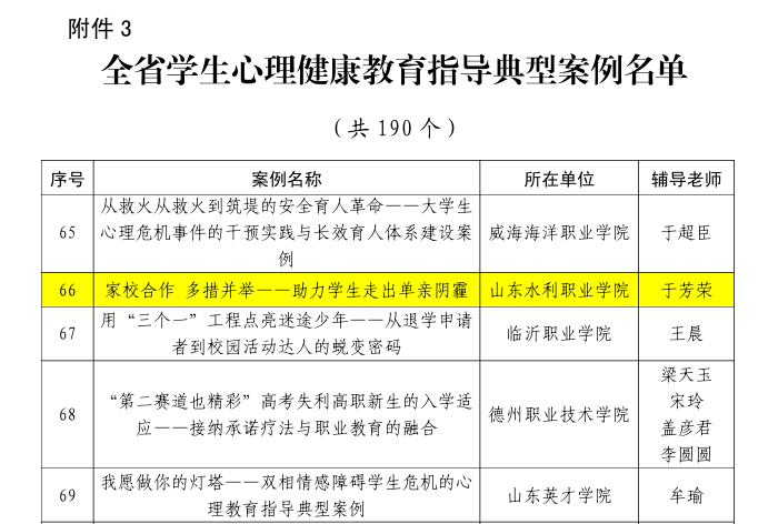 《“心灵守护”朋辈心理护航提升系列活动》聚焦学生实际心理需求,通过心理沙龙、朋辈互助等接地气的校园活动,为学生提供暖心帮助,因成效显著获评全省学生心理健康宣传教育月特色活动。学院大学生心理健康发展中心于芳荣老师将一线心理辅导的实践感悟凝练成《家校合作 多措并举 —— 助力学生走出单亲阴霾》案例,为同类型咨询工作提供了宝贵借鉴,获评全省学生心理健康教育指导典型案例。