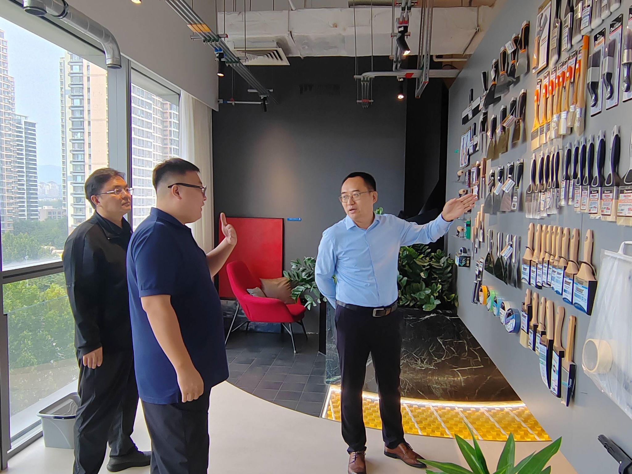 调研期间,林艳斌一行实地参观了青岛禾铸集团精造馆,深入了解企业在装饰工程领域的技术创新与实践应用。集团负责人围绕标准化装饰施工技术体系、绿色环保装饰材料研发与应用、BIM 技术在装饰工程全流程中的落地实践三大核心方向进行详细讲解,直观展示了行业前沿技术与企业发展特色,为专业教学与实践环节优化提供了宝贵参考。