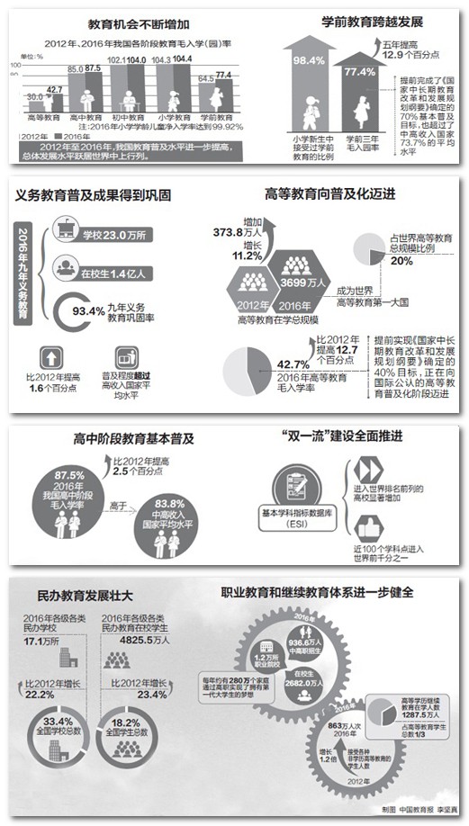 这一组令人振奋的数据,这一份令人惊叹的成绩单,展现出2012年至2016年这5年间,在实现教育现代化、努力让13亿人民享有更好更公平教育的愿景下,中国教育改革发展走过了不凡道路、取得了巨大成就。