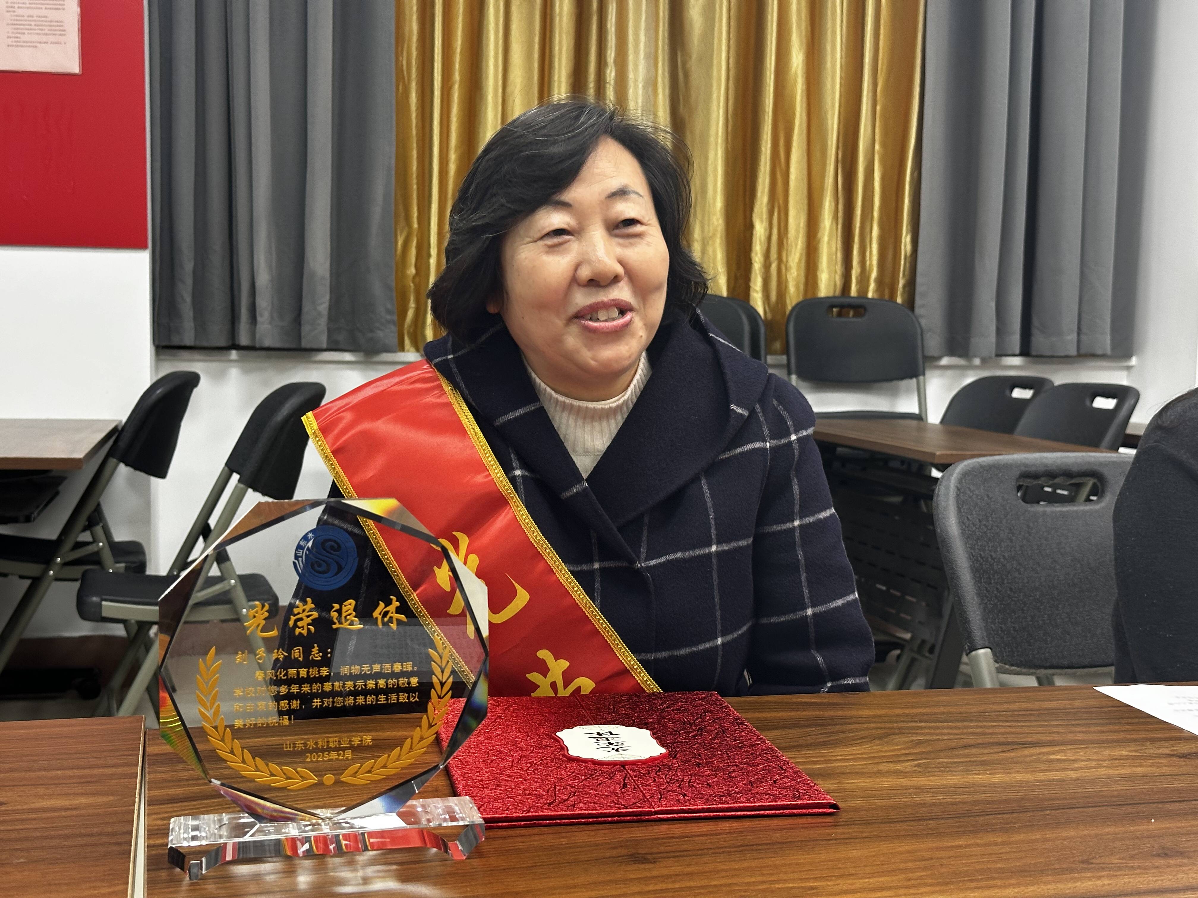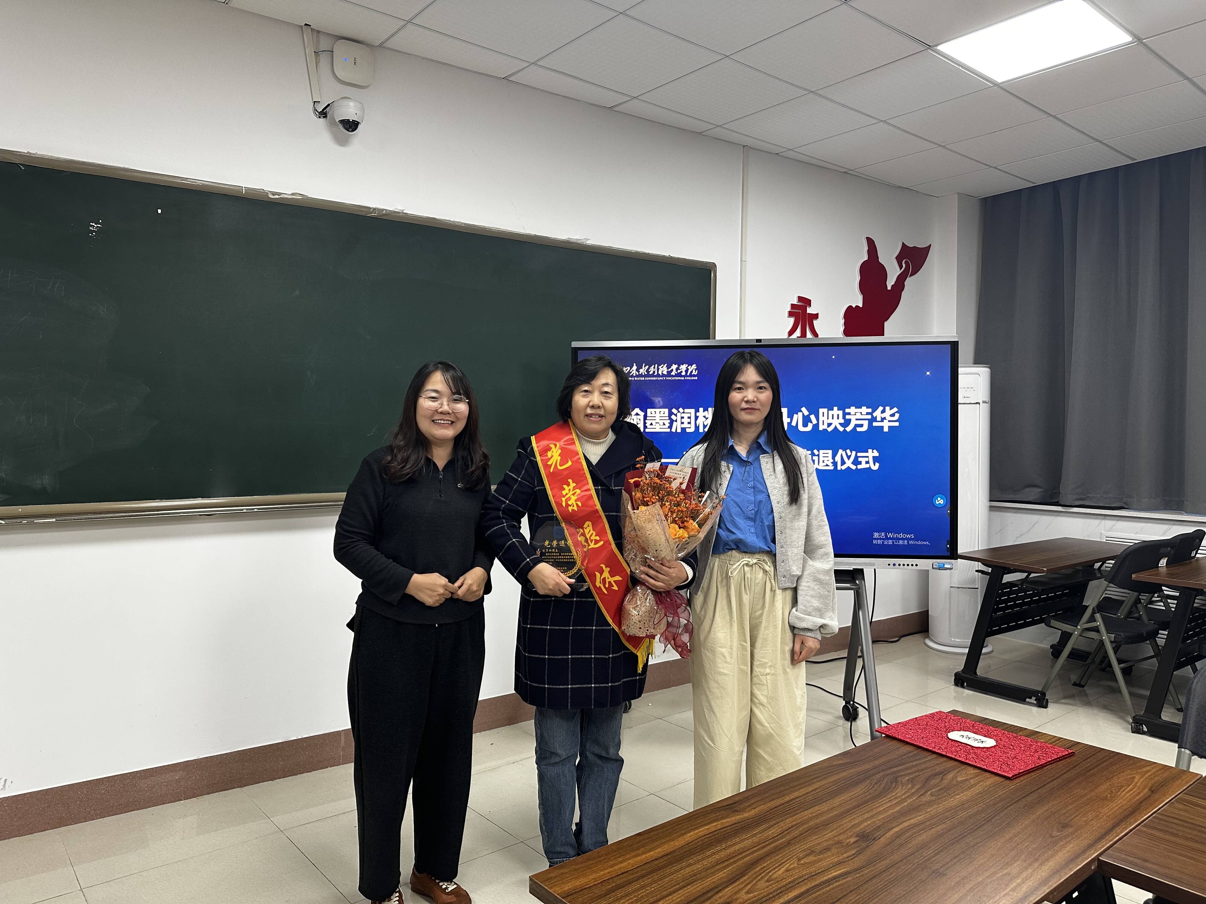 仪式伊始,沙登阁为刘子玲老师佩戴荣退绶带并颁发荣誉证书,向她多年来在教学岗位上的辛勤耕耘和默默奉献致以衷心感谢与崇高敬意。随后,语文教研室教师时文慧、闫灿向刘老师献上鲜花与水晶纪念杯,表达全体教师的诚挚祝福。全体与会人员与刘老师合影留念,现场气氛温馨感人。
