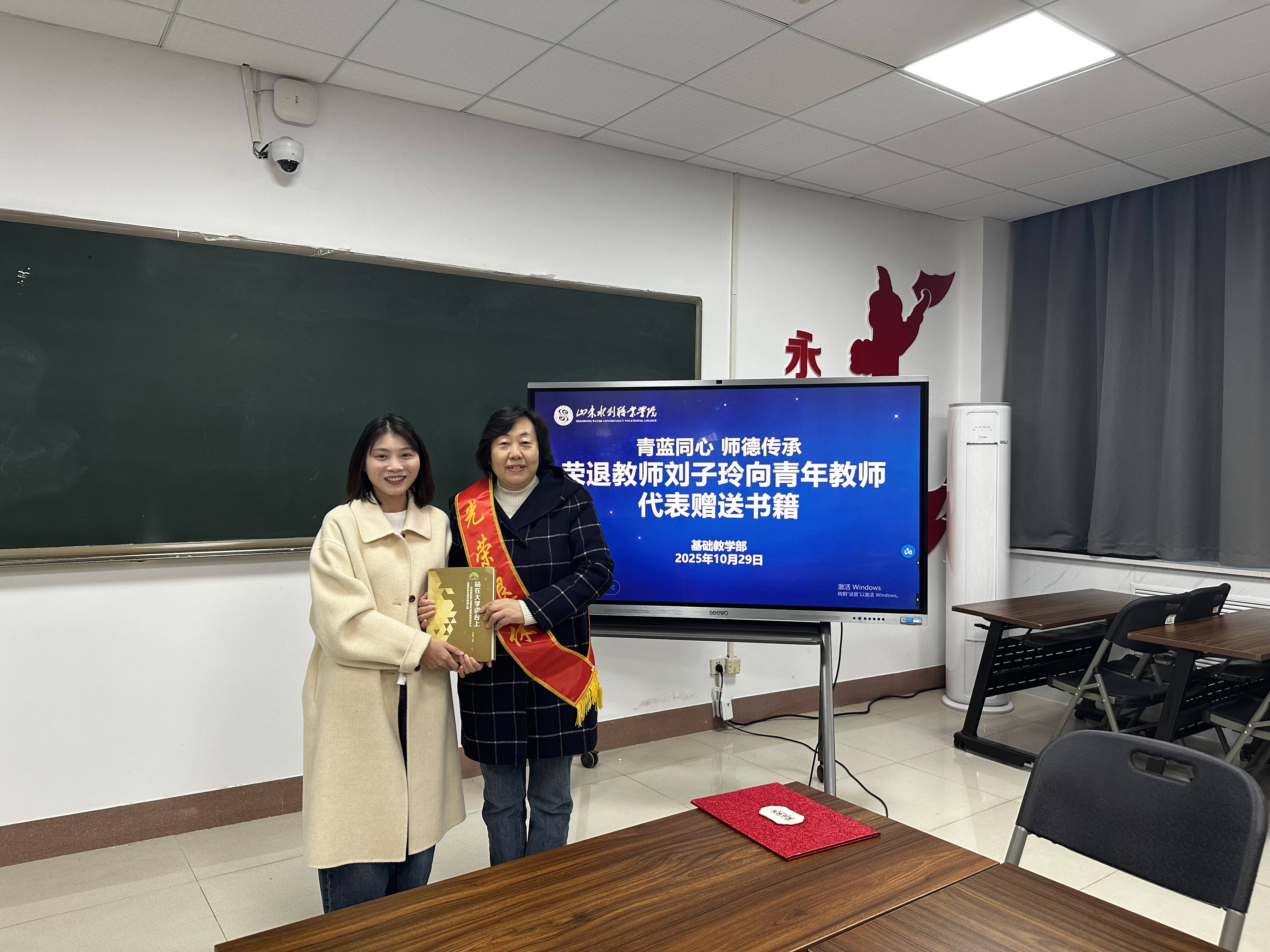在交流环节中,刘子玲老师向青年教师代表宋忠香赠送《站在大学讲台上》一书,勉励青年教师勤勉治学、潜心育人,在教书育人的道路上不断成长。青蓝同心、师道传承,这一温情举动,象征着教育精神的接续与传承,也体现了基础教学部“传帮带”的优良传统。刘老师深情回顾了自己在招生就业处及其他教学岗位上的奋斗历程,分享了从教多年的心得体会,并对青年教师提出殷切期望,鼓励大家坚守教育初心、不断追求进步。