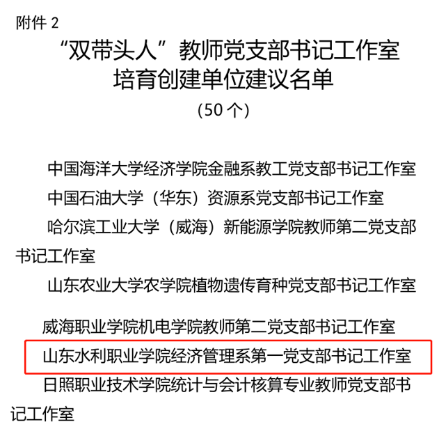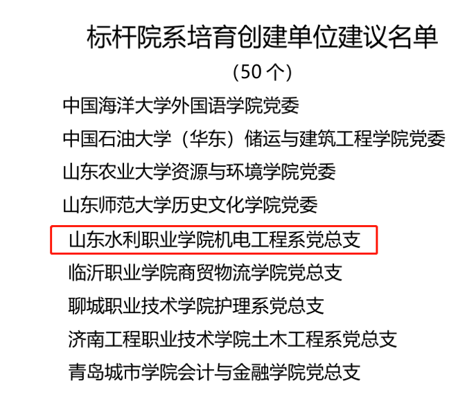 2023年7月24日,山东省委教育工委对第三批新时代高校党建工作示范高校、标杆院系、样板支部及第二批高校“双带头人”教师党支部书记工作室培育创建单位进行了公示,我院机电工程系党总支入选山东省第三批新时代高校党建工作标杆院系培育创建单位、经济管理系第一党支部书记工作室入选山东省第二批高校“双带头人”教师党支部书记工作室培育创建单位。