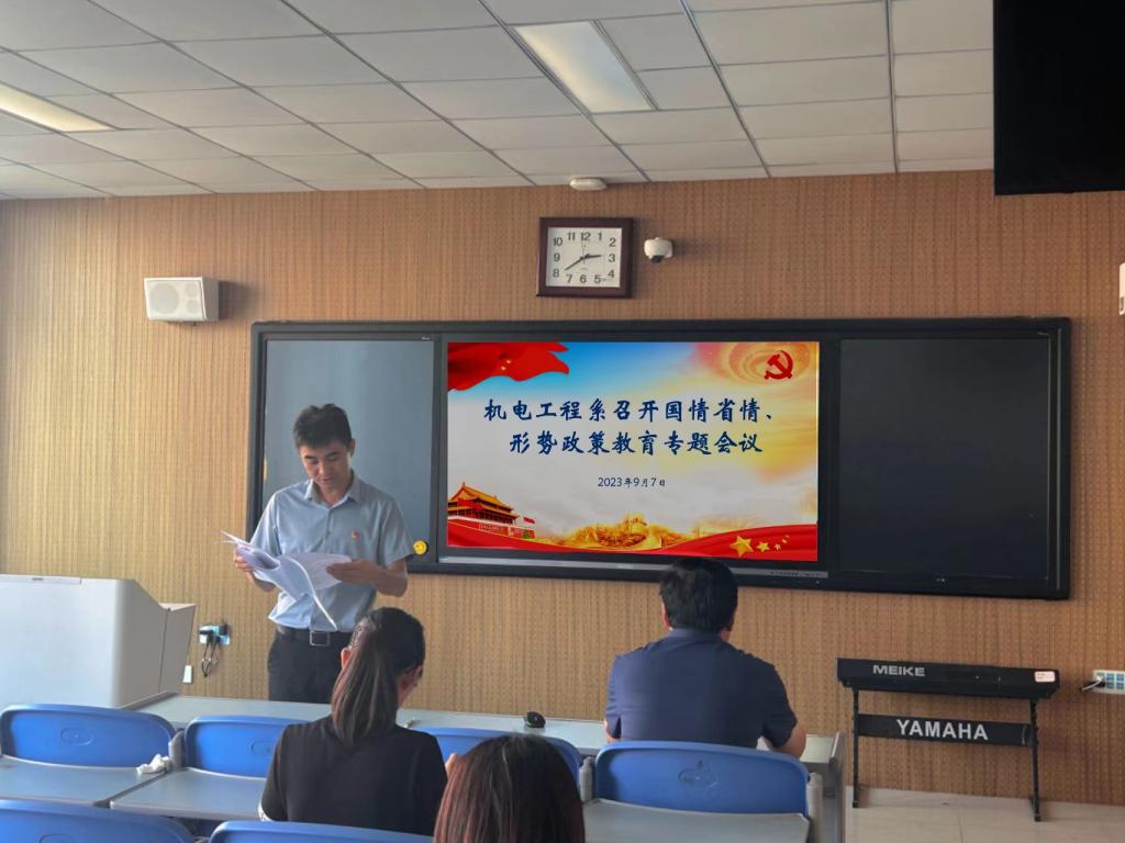 为深入学习贯彻习近平新时代中国特色社会主义思想,进一步深化爱国主义教育,强化国家安全意识,加强对当前国情和国际政治形势的了解,9月7日,机电工程系党总支组织开展国情省情、形势政策教育专题会议。