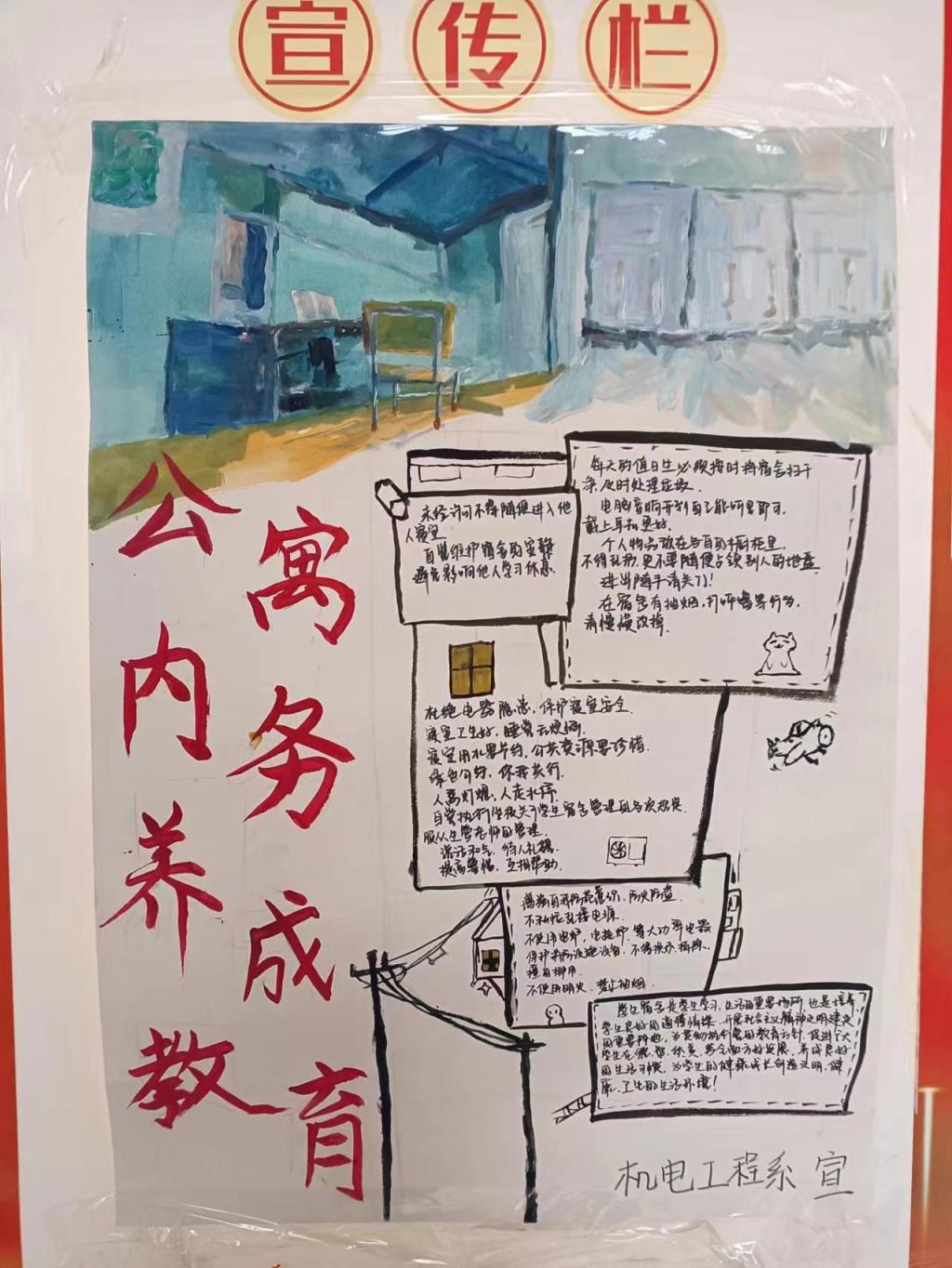 通过开展教育宣传海报征集活动和以“公寓内务养成教育——律‘净’”为主题的视频观赏活动,推动学生逐步树立起爱整洁、讲卫生、愿打扫的观念,为其行为习惯的改变提供根源性的催生动力。