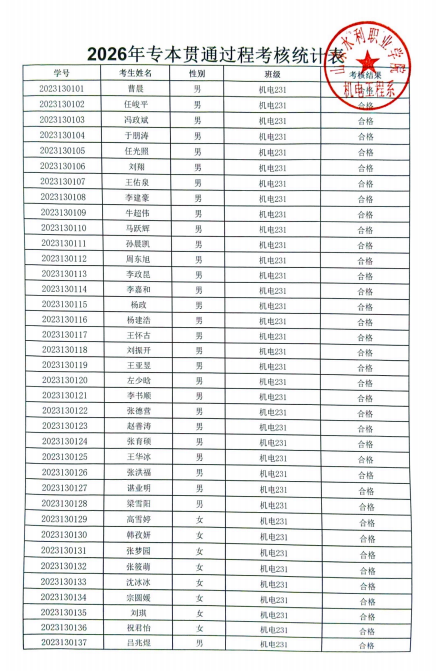 根据《山东省职业院校与本科高校对口贯通分段培养转段工作实施方案》(鲁教学发〔2015〕3号)和《关于做好2026年职业院校与本科高校对口贯通分段培养转段工作的通知》(鲁教学函〔2025〕22号)等文件精神,对我校机电一体化技术专业2026年“3+2”对口贯通分段培养班级学生过程考核合格名单予以公示,公示期7天,如有异议,请反馈2327办公室。名单如下: