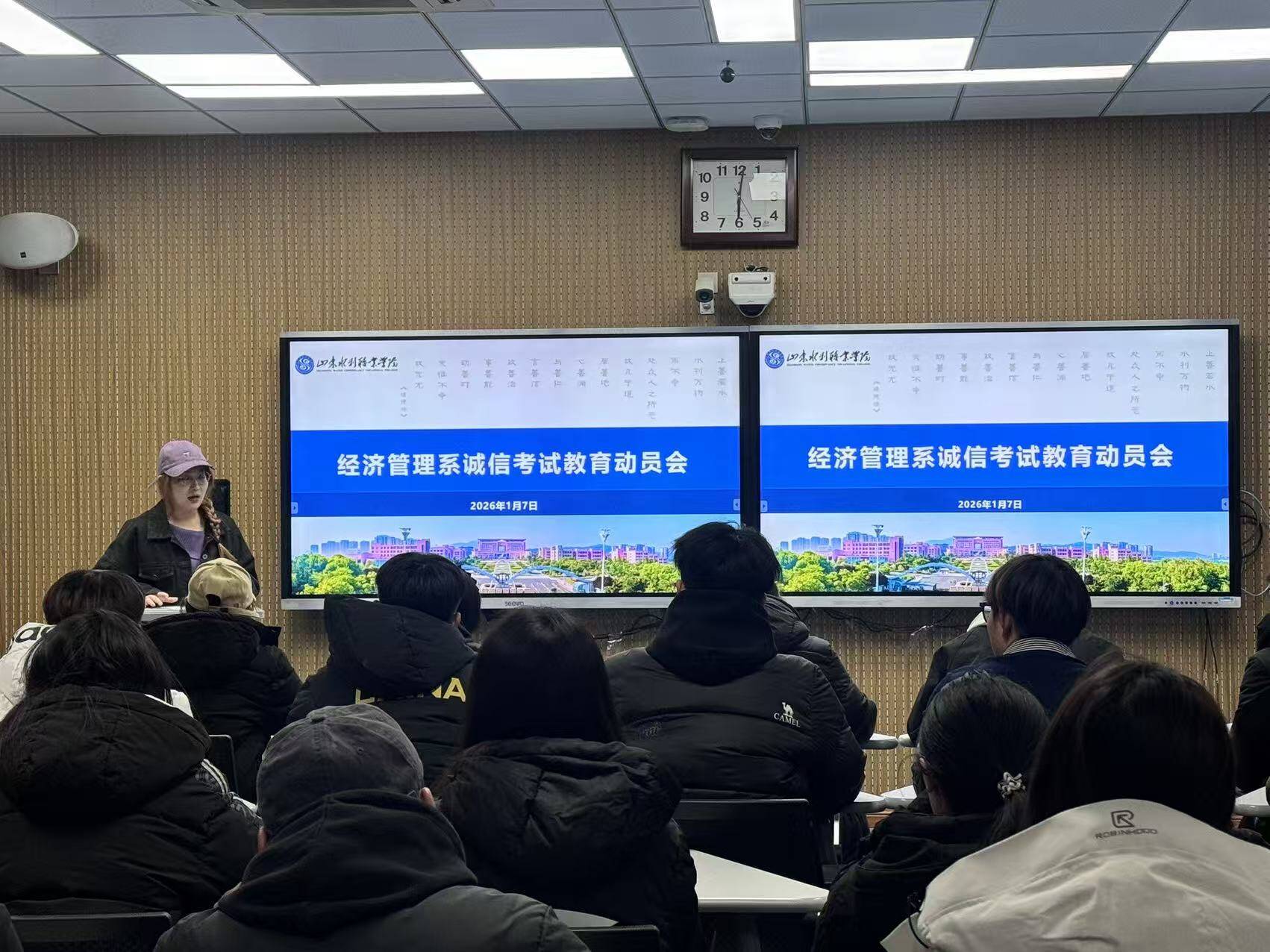经济管理系召开诚信考试教育动员大会,辅导员孟苗苗围绕考试时间、考试流程规范和纪律要求等关键环节进行了全面梳理,并结合实例分析了考试作弊对个人学业和职业生涯的严重危害,要求全体同学端正考试态度,遵守考场纪律,以真实水平检验学习成果。