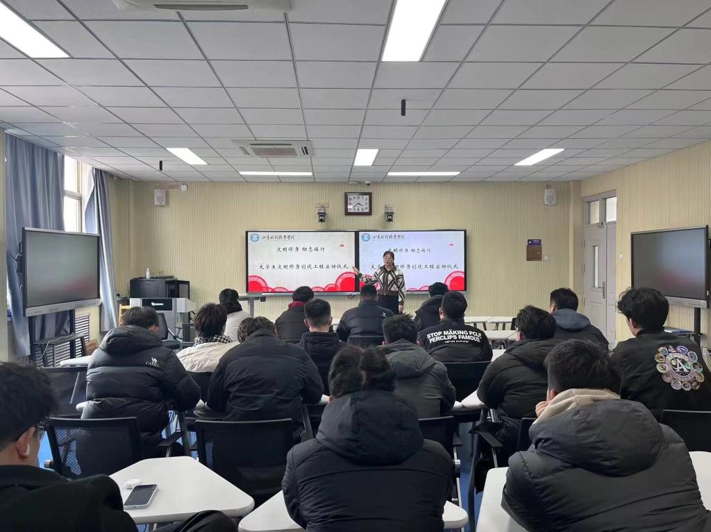 为进一步加强大学生思想政治教育,巩固和加强文明校园建设,提升大学生的思想道德水平和文明素养,3月4日,建筑工程系开展了以“文明修身,励志端行”为主题的大学生文明修身创优工程启动仪式。建筑工程系行政秘书薛琼老师、分管辅导员及全体班干部参加了仪式。