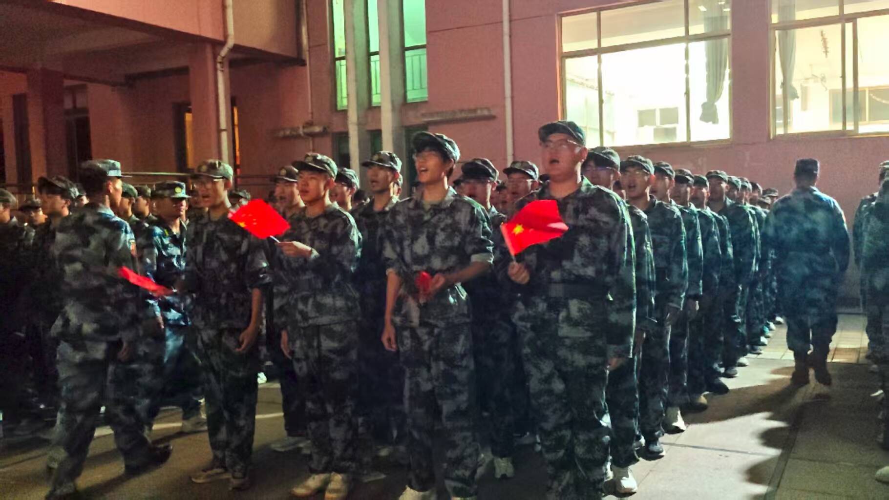 与此同时,系内新生方队在军事训练间隙同步开展 “红歌拉练赛”,各方队队列整齐、歌声嘹亮,《没有共产党就没有新中国》《歌唱祖国》等经典红歌轮番上演,以青春之声致敬革命先辈。