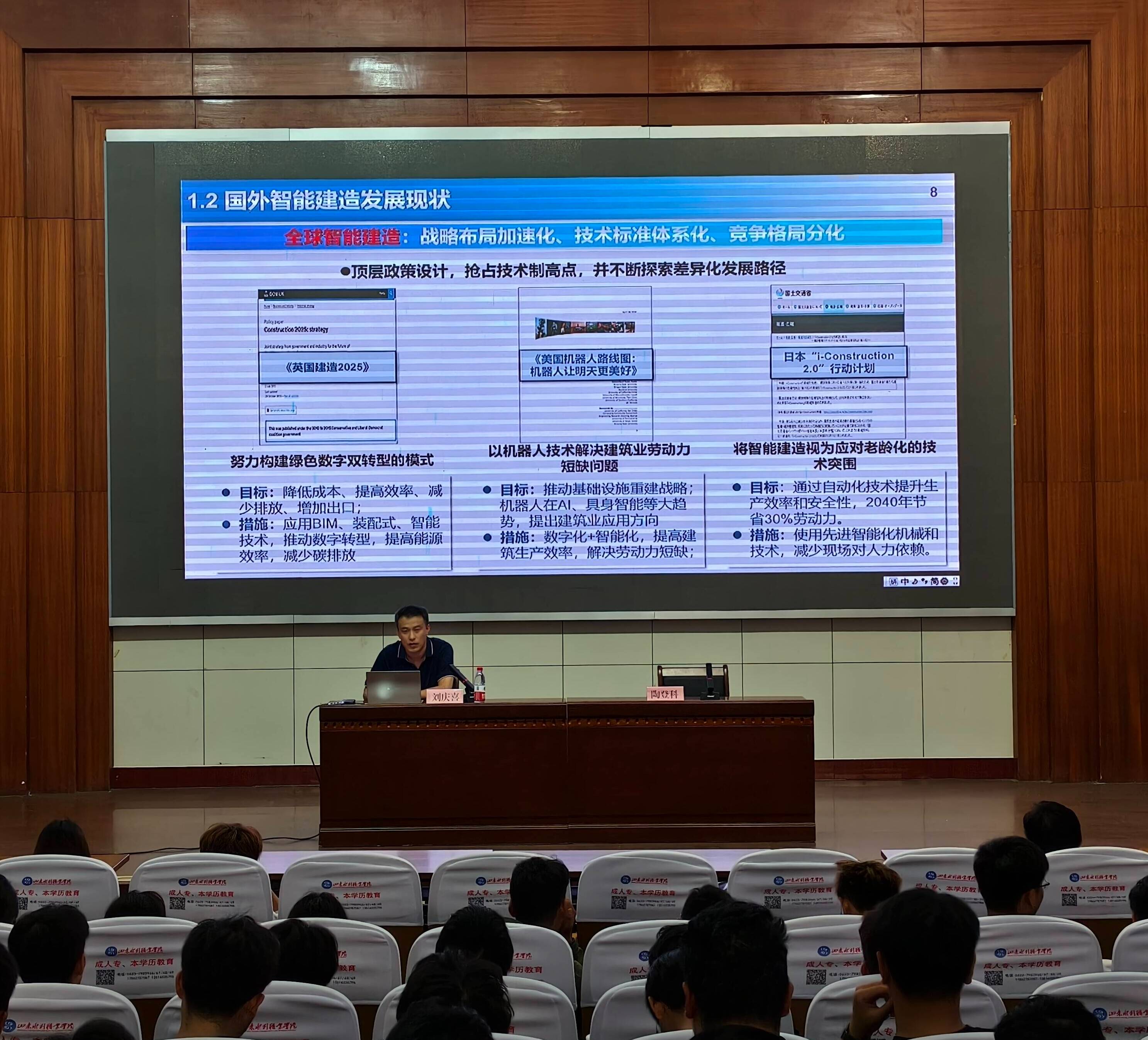 为深化产教融合、推动建筑行业数字化转型、赋能学生职业成长,9月18日上午,建筑工程系在学术报告厅举办了“企业大师进校园”专题报告会。特邀中建八局二公司智能建造事业部总经理、山东省装备制造业协会专家委员会委员刘庆喜作《智能建造建筑产业现代化的探索与实践》专题报告。建筑工程系相关领导、师生近400人参加了此次报告会。