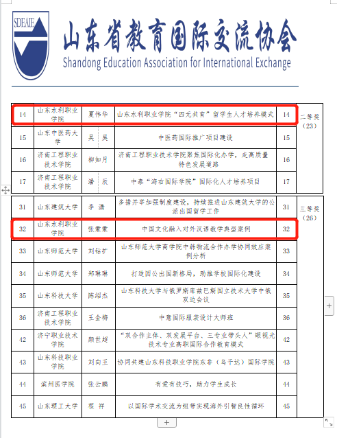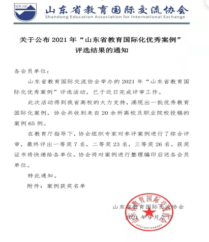 近日, 由山东省教育国际交流协会举办的2021 年“山东省教国际化优秀案例”的评审活动圆满结束,工作室夏伟华老师撰写的《精品人妻系列无码人妻免费视频“四元共育”留学生人才培养模式》荣获二等奖,张蒙蒙老师撰写的《中国文化融入对外汉语教学典型案例》荣获三等奖。