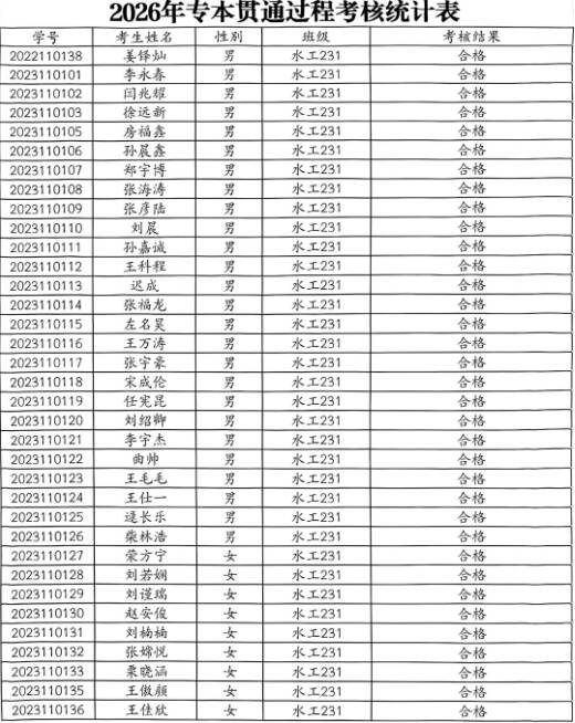 根据《山东省职业院校与本科高校对口贯通分段培养转段工作实施方案》(鲁教学发〔2015〕3号)和《关于做好2026年职业院校与本科高校对口贯通分段培养转段工作的通知》(鲁教学函〔2025〕22号)等文件精神,对我校水利工程专业2026年“3+2”对口贯通分段培养班级学生过程考核合格名单予以公示,公示期7天,如有异议,请反馈7205办公室。名单如下: