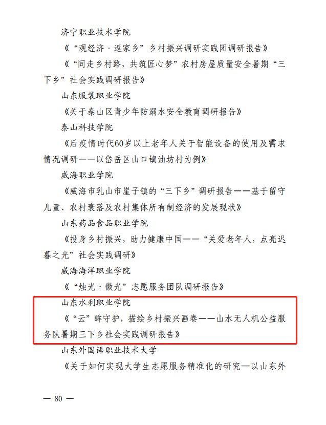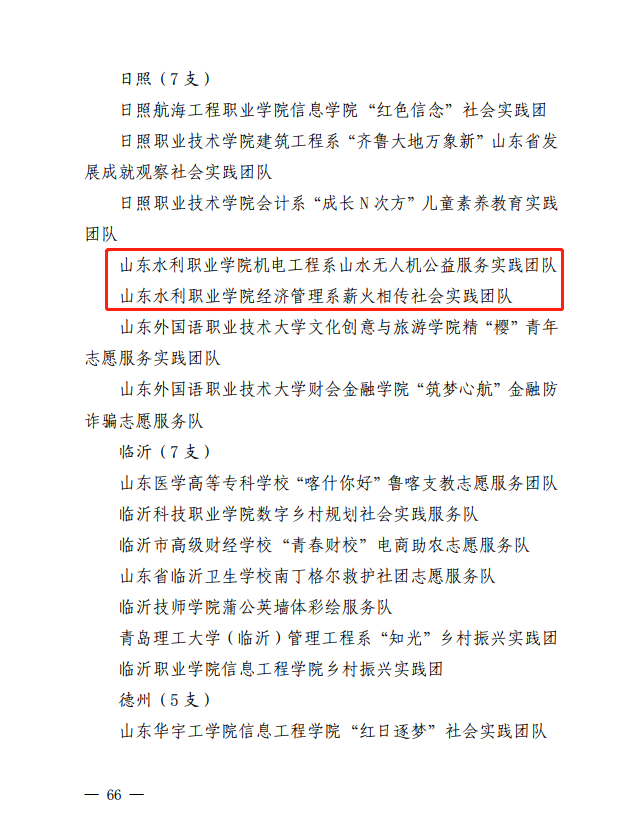 我院机电工程系山水无人机公益服务实践团队、经济管理系薪火相传社会实践团队2支队伍荣获“社会实践优秀服务团队”称号;《“云”眸守护,描绘乡村振兴画卷——山水无人机公益服务队暑期三下乡社会实践调研报告》荣获“社会实践优秀调研报告”;丁程等4位老师荣获“优秀指导教师”称号;王述彬、王帅强等9位同学被授予“社会实践优秀学生”称号。