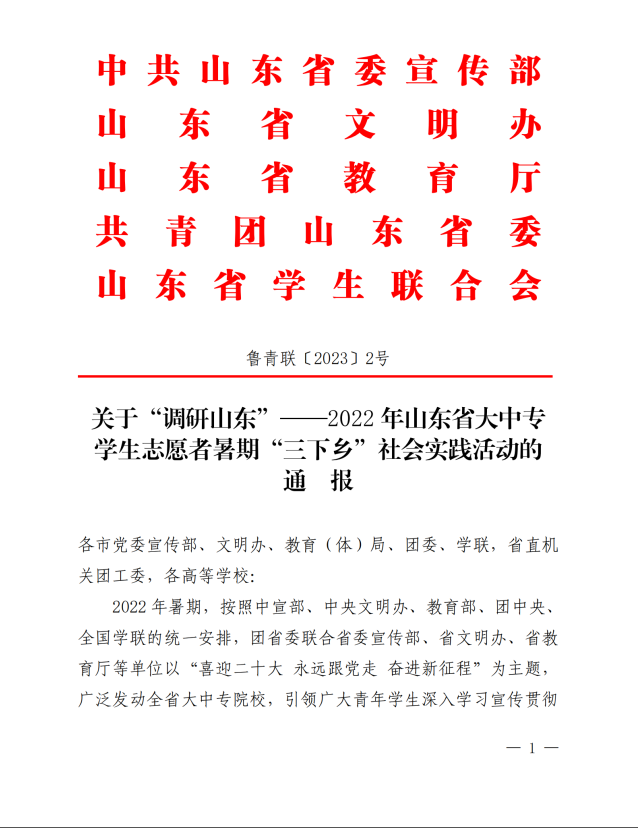 近日,由省委宣传部、省文明办、省教育厅、团省委和省学联等五部门联合发布《关于“调研山东”——2022年山东省大中专学生志愿者暑期“三下乡”社会实践活动的通报》,对大中专学生暑期“三下乡”社会实践活动中表现突出、做出显著成绩的优秀单位和个人给予了表彰。