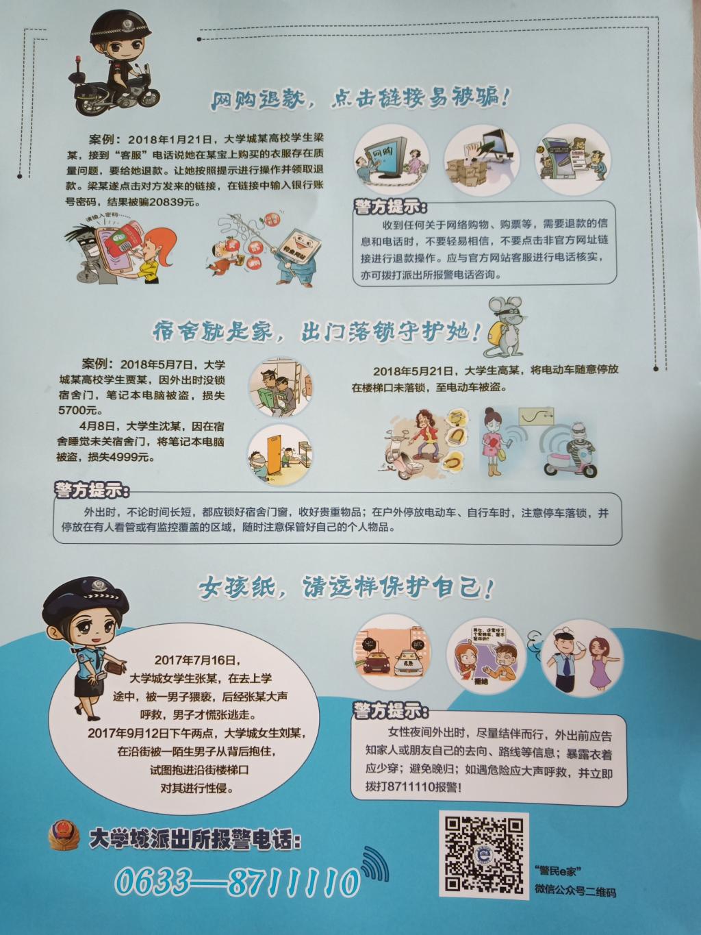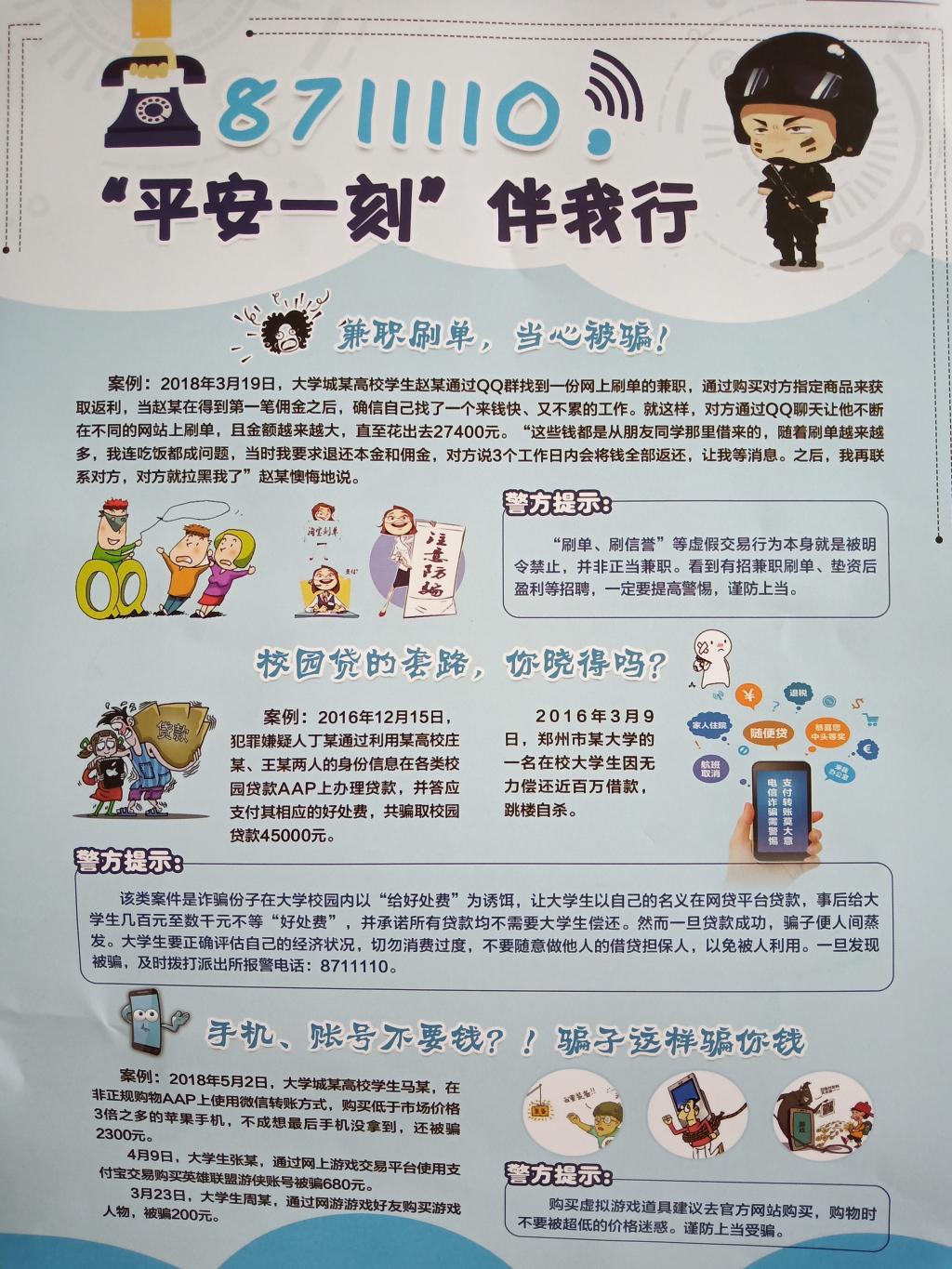 为做好新生群体防范电信网络诈骗的精准宣传工作,9月18日我校邀请东港区公安局开展了“8711110,平安一刻伴我行”防范电信网络诈骗宣传系列活动。