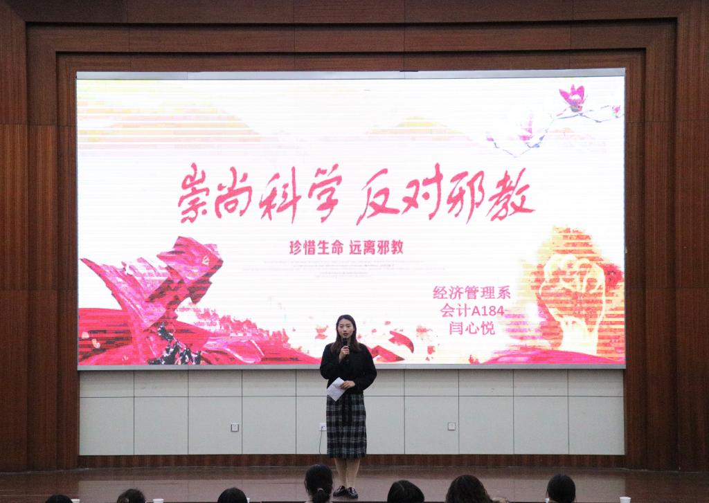 为宣传崇尚科学,反对邪教迷信,坚持共产主义的理想信念,打造平安和谐校园,我校于12月6日晚在学术报告厅举行“崇尚科学反对邪教”演讲比赛。