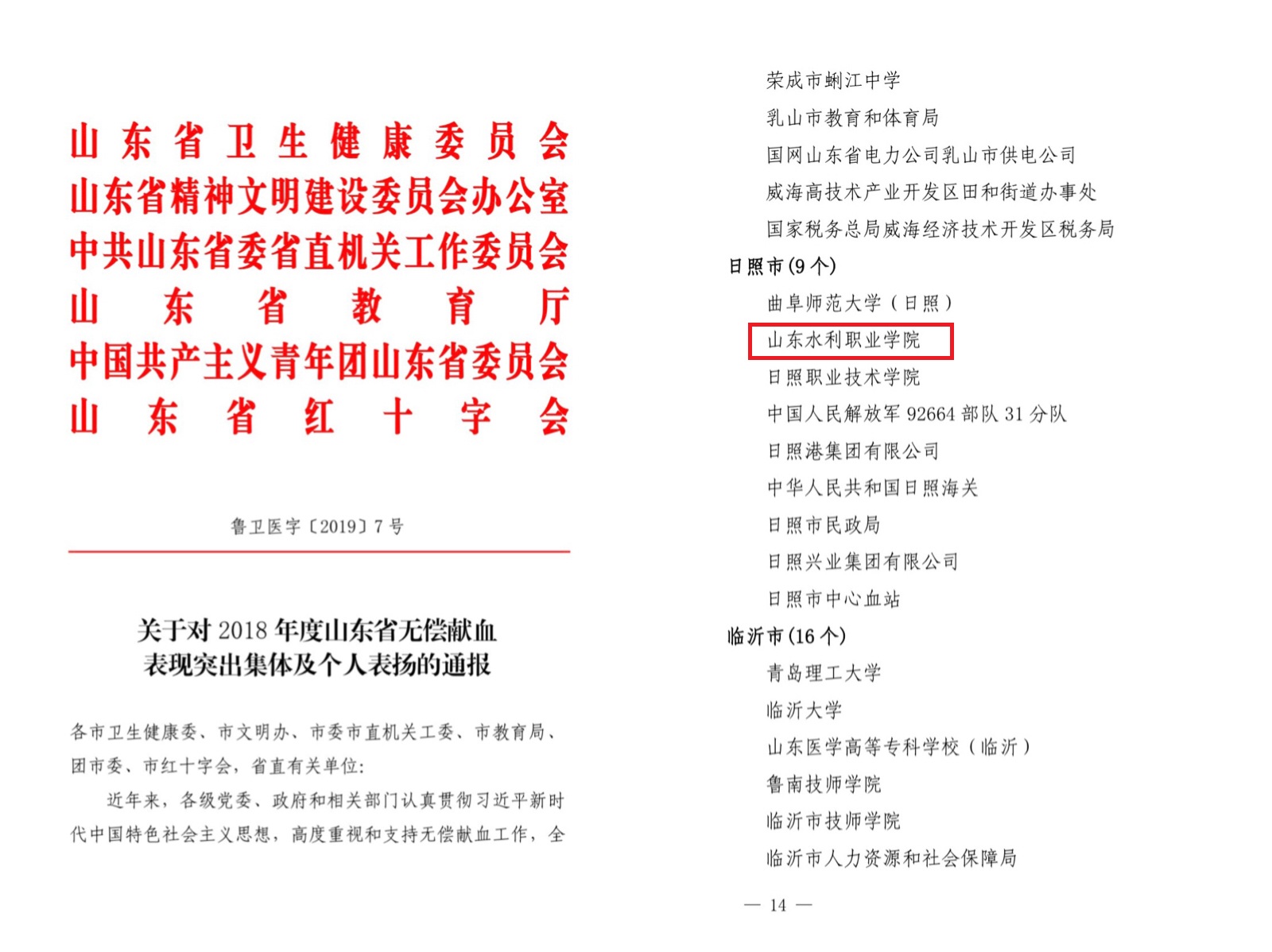 近日,由省卫生健康委、省文明办、省教育厅、团省委等六部门联合下发《关于对2018年度山东省无偿献血表现突出集体及个人表扬的通报》,对无偿献血先进单位及个人予以表彰。我校荣获“2018年度山东省无偿献血先进单位”荣誉称号;无偿献血志愿服务大队荣获“2018年度山东省无偿献血志愿服务先进集体”荣誉称号;李晓婧、王婧两位老师荣获“2018年度山东省无偿献血工作先进个人”荣誉称号。