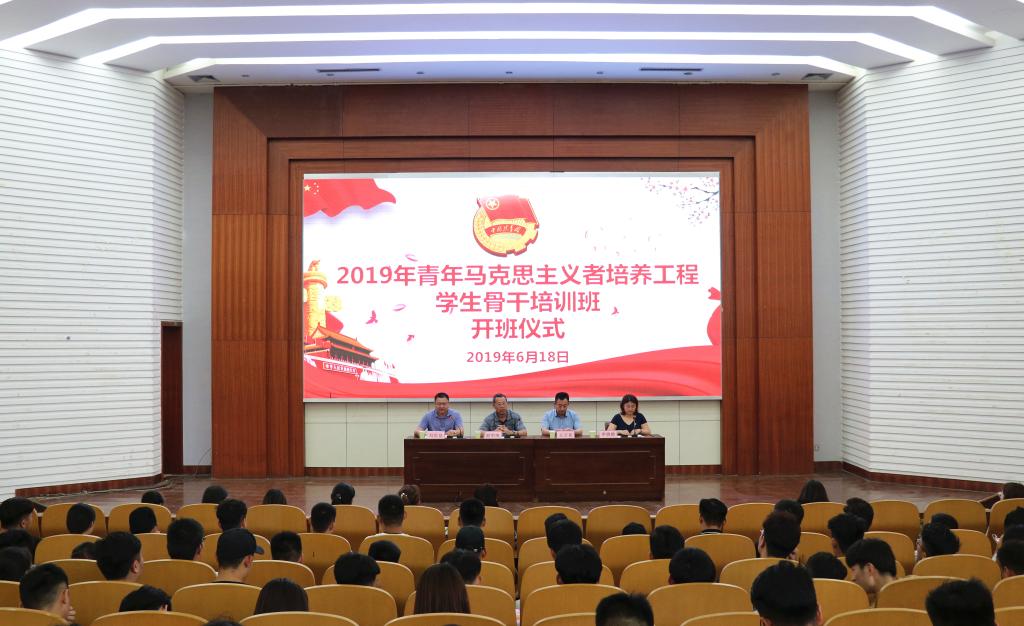 6月18日下午,我校2019年“青年马克思主义者培养工程”学生骨干培训班开班仪式在学术报告厅隆重举行。学校党委副书记赵明阁、学生工作处处长王万喜、校团委、各系团学负责人及学生代表共300余人参加了开班仪式。开班仪式由学生工作处副处长刘世良主持。