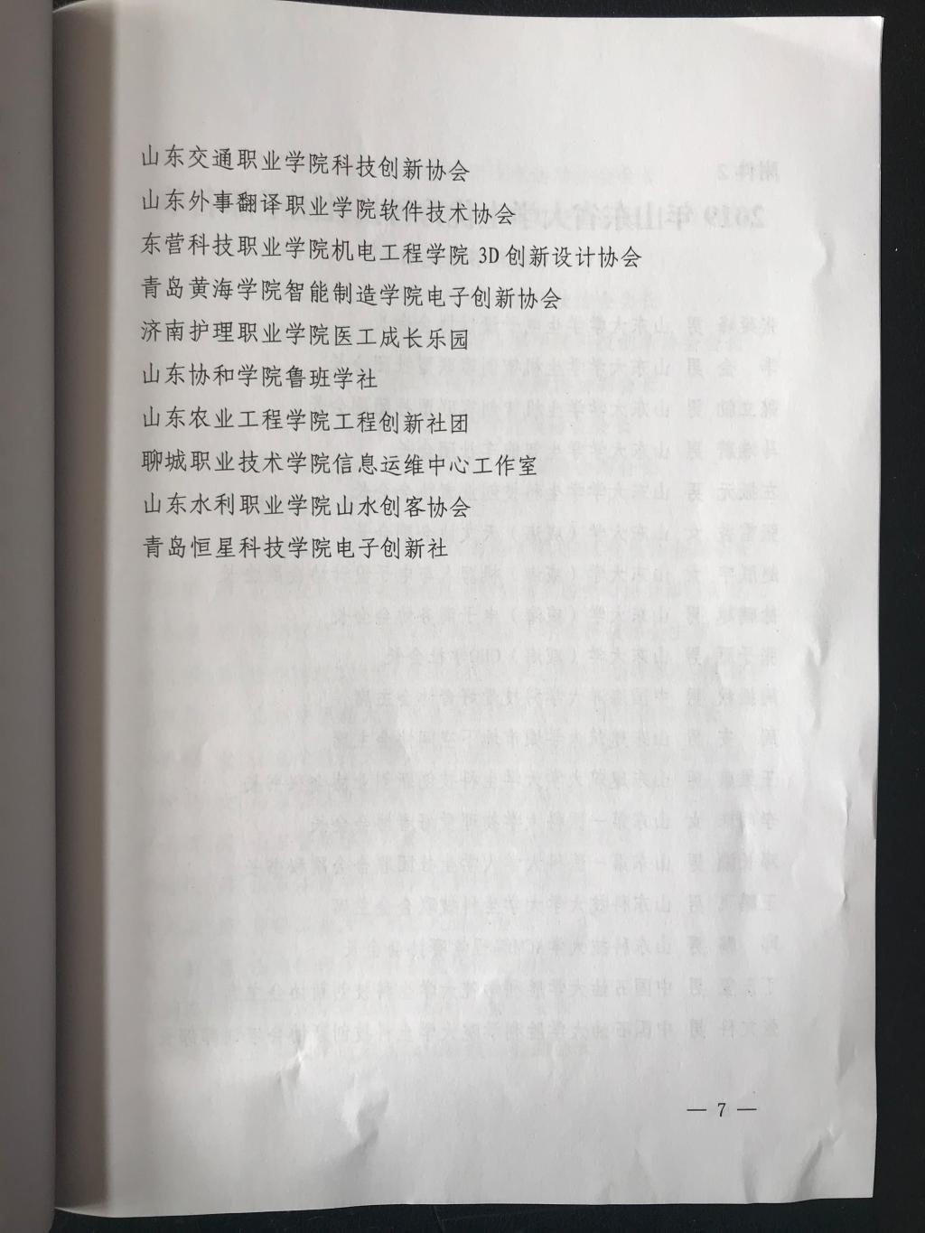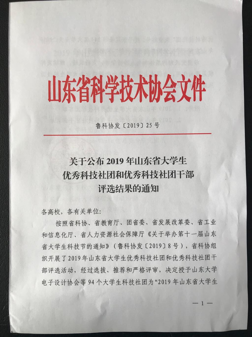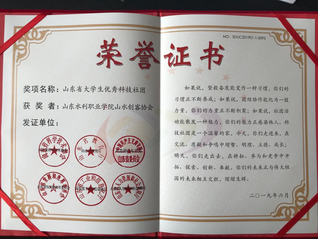 近日,由山东省科协、山东省教育厅、共青团山东省委、山东省发改委和山东省人社厅共同举办的2019年山东省大学生优秀科技社团和优秀科技社团干部评选活动圆满落下帷幕。我院推荐的山水创客协会荣获“山东省大学生优秀科技社团”。