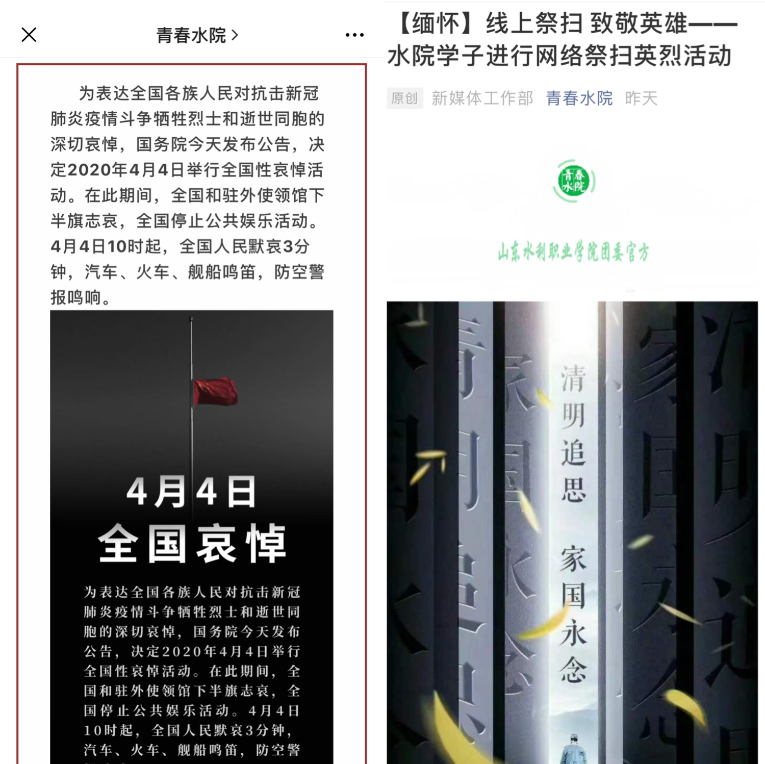 移风易俗,树立新风。清明节期间,我校“青春水院”微信公众号相继推出“居家追思 网络祭扫”、“线上祭扫 致敬英雄”等文明祭扫专题,积极宣传引导广大青年学生移风易俗、文明祭扫、环保祭扫、安全祭扫,并对水院学子的网络祭扫进行了集中宣传,传递青春正能量,营造文明、环保、节俭、安全的良好祭扫氛围。