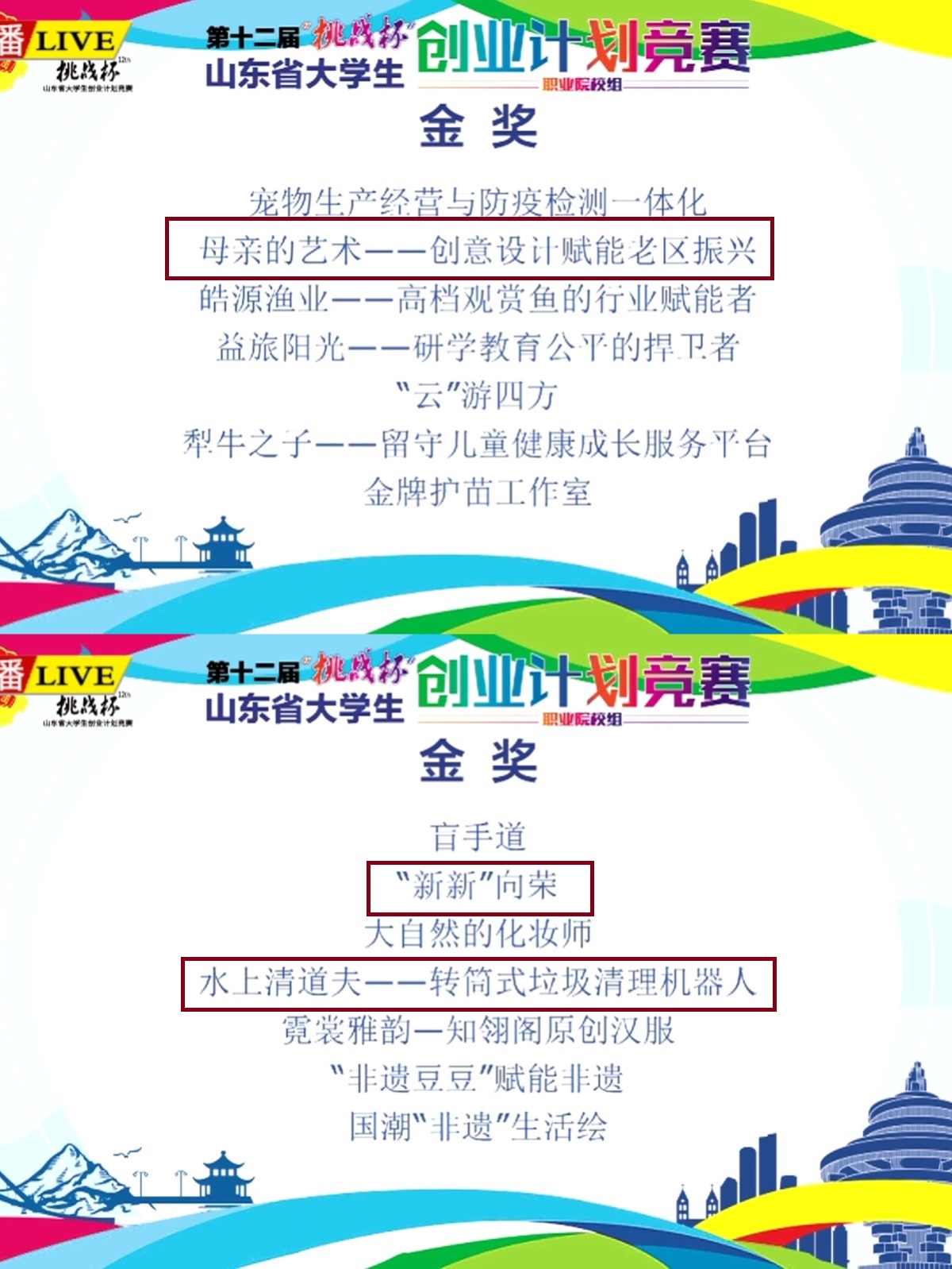 本次大赛由共青团山东省委、山东省教育厅等部门主办,收到参赛作品1342件,全省有45所职业院校参加大赛,产生金奖项目21个。7月31日,历时两个月的校赛顺利结束,413名学生54个项目参与其中。经过宣传发动、项目研磨、校内初评、答辩评审、专家指导等环节,有5个项目代表学校角逐省赛复赛。经过复赛环节的严格评审,我校4个项目入围,向省赛决赛发起冲击。经过线上激烈角逐、专家导师客观公正的评审,最终《母亲的艺术—创意设计赋能老区振兴》《“新新”向荣》《水上清道夫—转筒式垃圾清理机器人》三个项目摘得决赛金奖。其中,《母亲的艺术—创意设计赋能老区振兴》和《“新新”向荣》两个项目获得了冲击全国总决赛的资格。