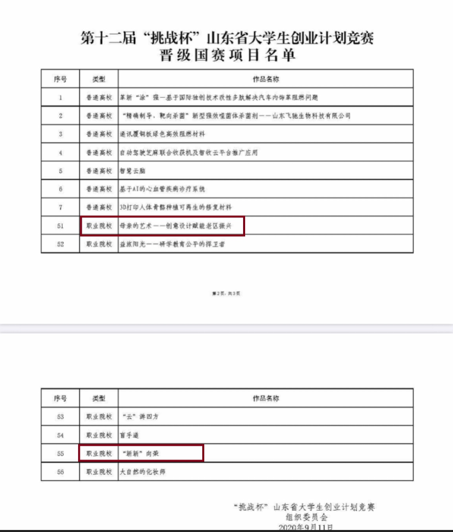 9月11日,第十二届“挑战杯”山东大学生创业计划竞赛(职业院校组)公布获奖名单。我校斩获三金一银一铜,学校获得“优秀组织奖”,以团体优异的成绩捧得本届大赛“优胜杯”。这是我校参加该项赛事以来首次获得“优胜杯”,其中,两个金奖项目取得了冲击全国决赛的资格,刷新了我校参加“挑战杯”的历史最好成绩。