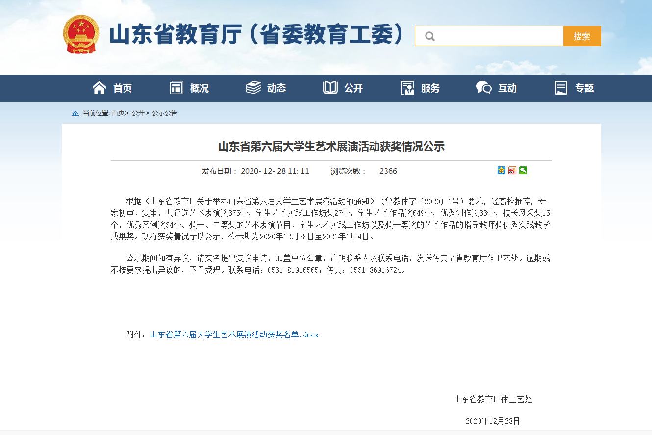 山东省大学生艺术展演,由省教育厅举办,每三年举办一届,是山东省规格最高、规模最大、参与面最广、影响力最大的大学生艺术盛会,是集中展示高校美育教育成果的重要活动。学校严格落实教育部要求,深入学习贯彻习近平总书记关于教育的重要论述和全国教育大会精神,克服疫情影响,全力备赛,高标准地完成了各项展演项目,向全省高校和专家们展现了我校美育教育的优秀成果。