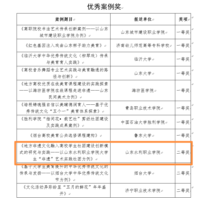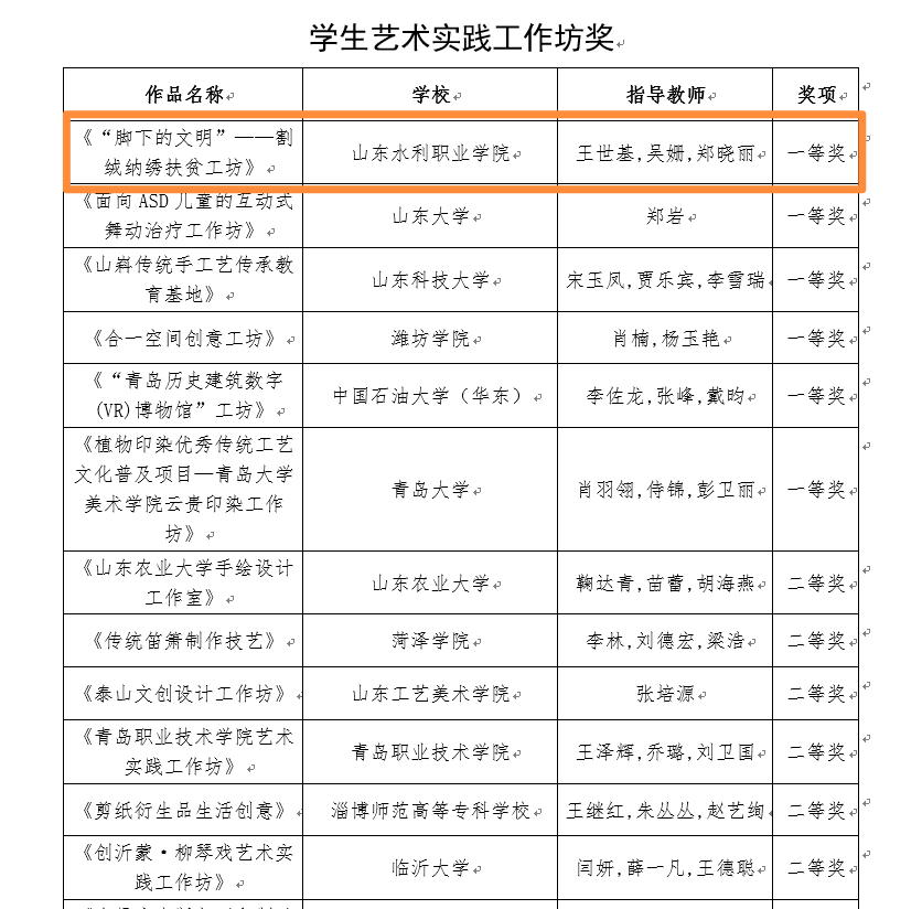 12月28日,山东省第六届大学生艺术展演活动圆满落下帷幕。我校推送的《“脚下的文明”——割绒纳绣扶贫工坊》获艺术实践工坊类一等奖、《地方非遗文化融入高校学生社团建设创新模式的研究与实践——以精品人妻系列无码人妻免费视频大学生“非遗”艺术实践社团为例》荣获美育改革创新案例类二等奖,两个项目全部入围国赛。