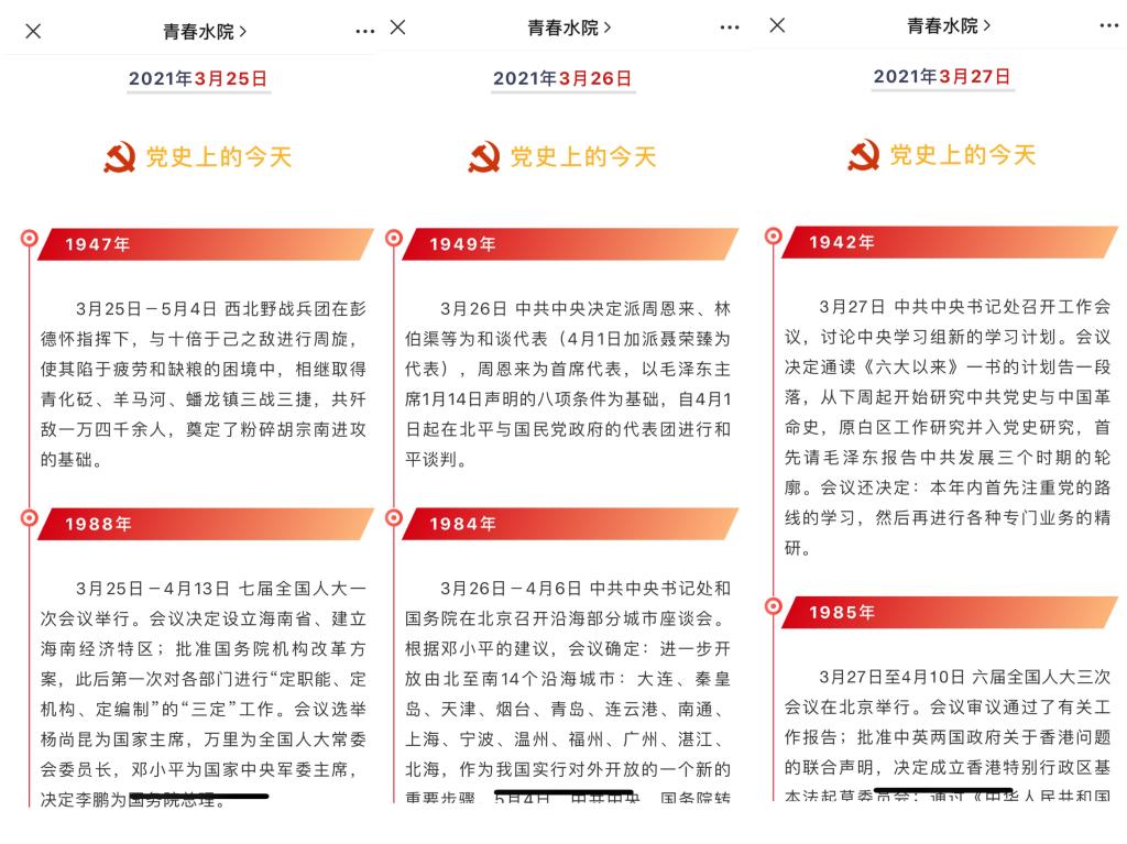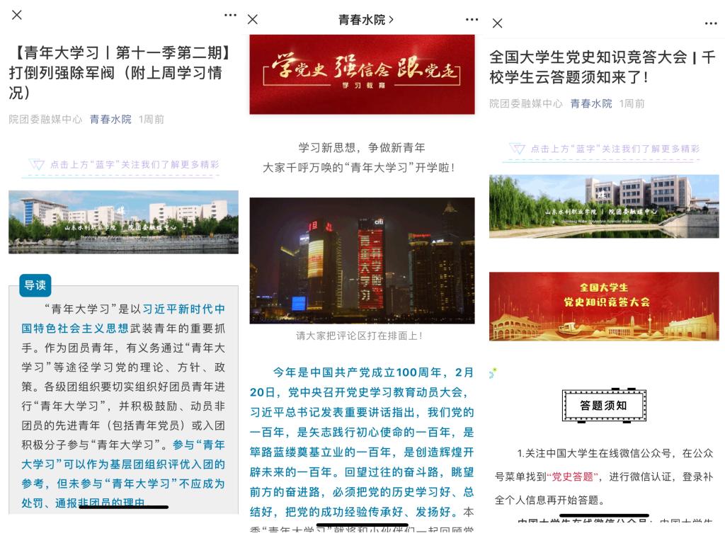 线上学党史,锤炼党性践初心。自三月以来,组织全体学生参加“青年大学习”网络知识学习,观看优秀党史专题视频,参加全国大学生党史知识竞答大赛,校团委通过官微发布“学党史·迎百年”专栏,通过线上专题活动使青年学生真正充分认识到党史学习的重要意义,认识到要不断增强历史意识,强化使命担当,把学习成效转化为工作动力,用实际行动献礼中国共产党成立100周年。