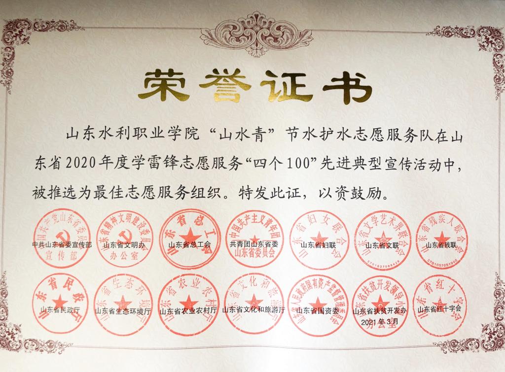 近日,由山东省委宣传部等14部门组织推选的“2020年度全省学雷锋志愿服务‘四个100’先进典型”名单公布,我校“山水青”节水护水志愿服务队获“最佳志愿服务组织“荣誉称号。日照市委宣传部、文明办、民政局、团市委等部门对2020年全市志愿服务组织进行评选,“山水青”节水护水志愿服务队再次获得“最佳服务组织”荣誉称号。