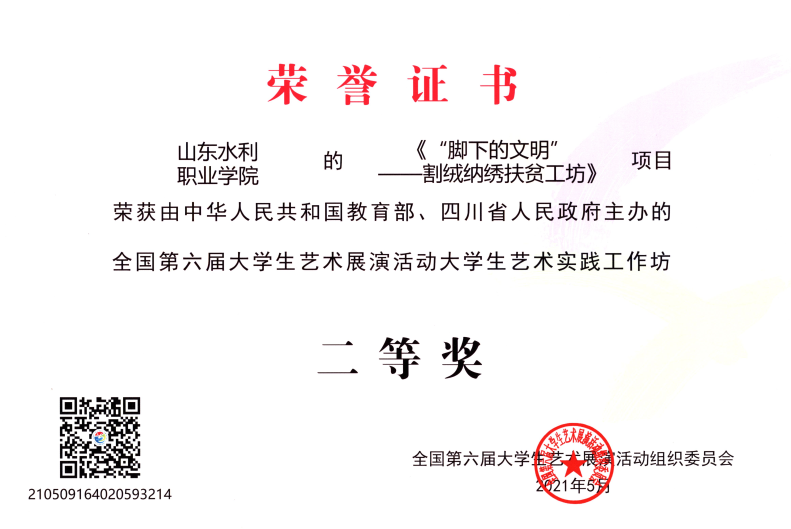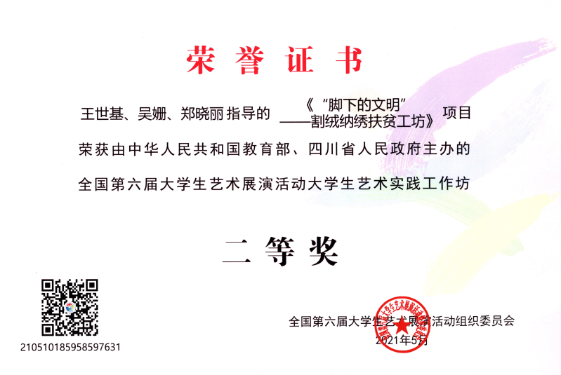 日前,全国第六届大学生艺术展演活动在四川成都落下帷幕。我校推报的《“脚下的文明”——割绒纳绣扶贫工坊》《地方非遗文化融入高校学生社团建设创新模式的研究与实践——以精品人妻系列无码人妻免费视频大学生“非遗”艺术实践社团为例》的两个项目分别获大学生艺术实践工作坊二等奖和高校美育改革创新优秀案例三等奖的好成绩。