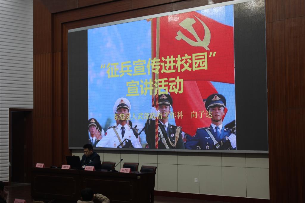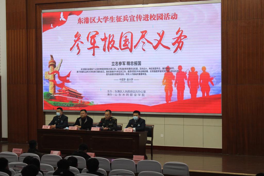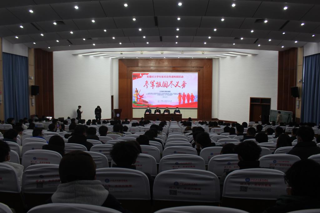 12月24日,为深入贯彻落实全国大学生征兵工作的会议精神,鼓励优秀学子积极参军入伍、施展才干,东港区2022年征兵宣传进校园活动启动仪式在我校行政办公楼报告厅举行。东港区人武部部长闫鲁昌、东港区人武部政治工作科、军事科相关同志、学院学生处副处长刘世良、驻日各高校征兵工作站站长出席活动,我校辅导员及学生代表参加此次活动。