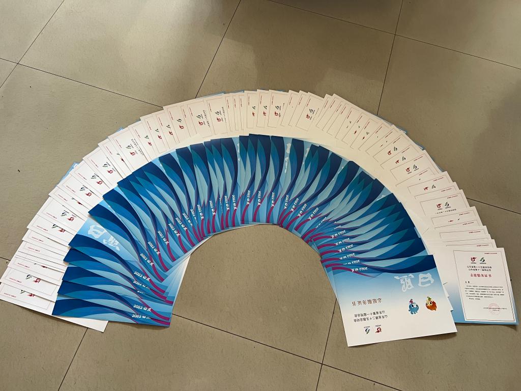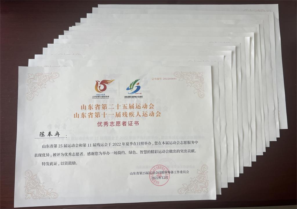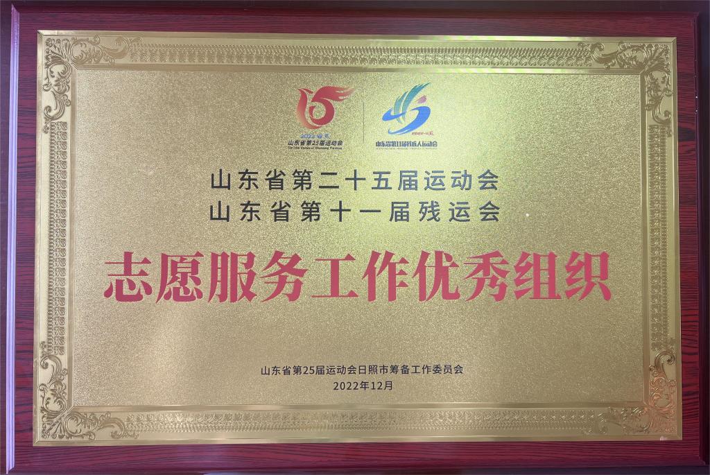 近日,山东省第25届运动会日照市筹备工作委员会颁发了山东省第二十五届运动会和第十一届残疾人运会志愿服务优秀组织奖和优秀志愿者证书,对在省运会志愿服务过程中有突出贡献的组织和志愿者进行了表彰,我院157名志愿者获得志愿服务证书,其中15名志愿者被评为优秀志愿者,学院获“志愿服务工作优秀组织奖”。