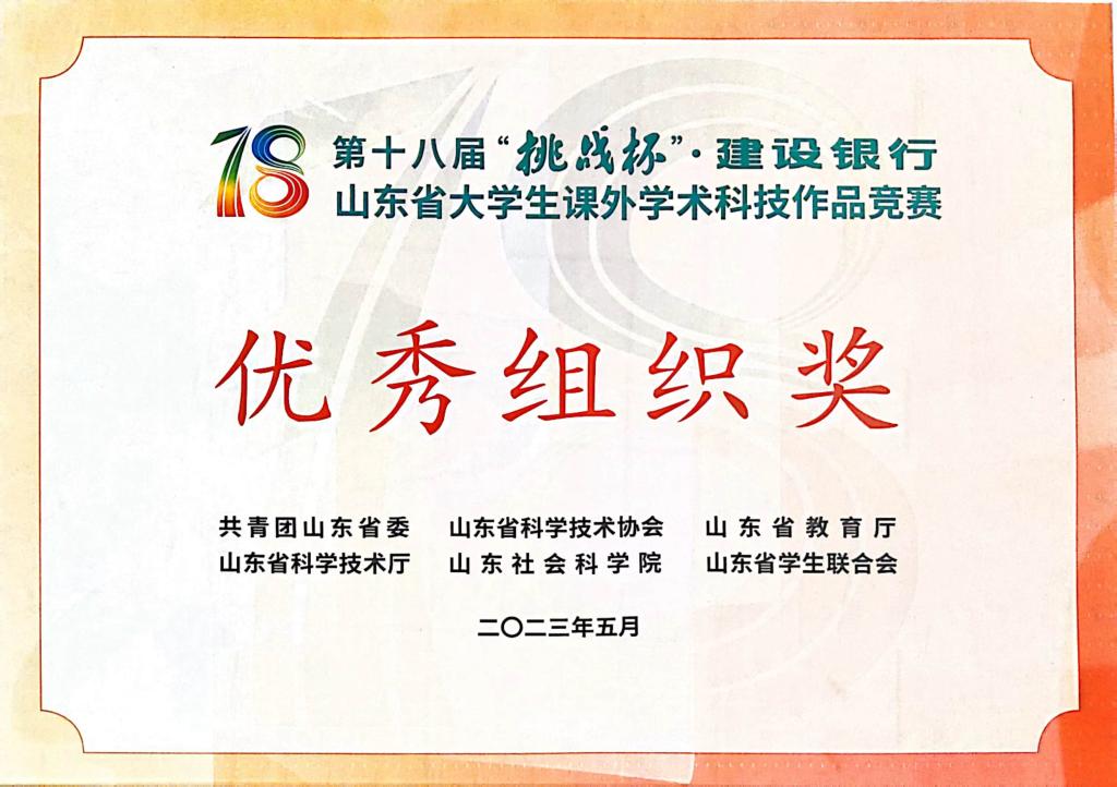 5月22日,第十八届“挑战杯”山东省大学生课外学术科技作品竞赛闭幕式暨颁奖仪式在齐鲁工业大学(山东省科学院)落下帷幕。学院再次捧得大赛的“优胜杯”和“优秀组织奖”。
