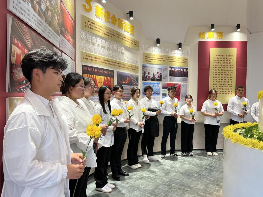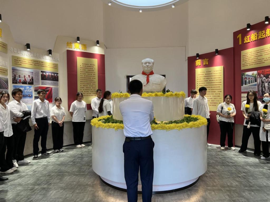 主题馆参观结束后,全体学员在鲜花堂为毛泽东同志献花,并共同唱响《没有共产党就没有新中国》,以鲜花寄托对先烈的敬意,以歌声感怀那段艰苦岁月。随后,在中心大厅,新团员们举起右拳,在团旗前庄严宣誓,铿锵有力的声音更加坚定了全体团员的决心,表达了同学们为团组织增光添彩的豪迈激情和无限向往。