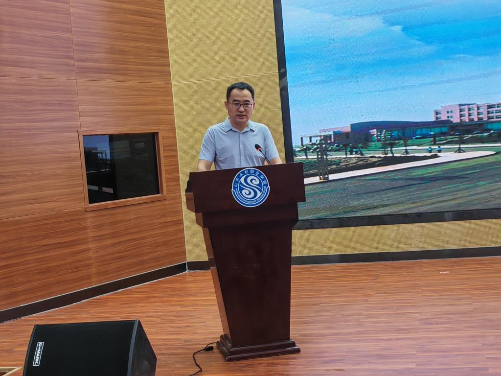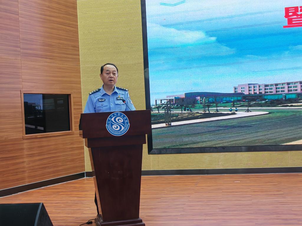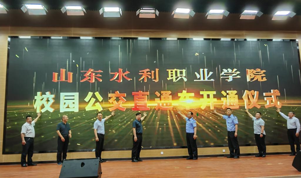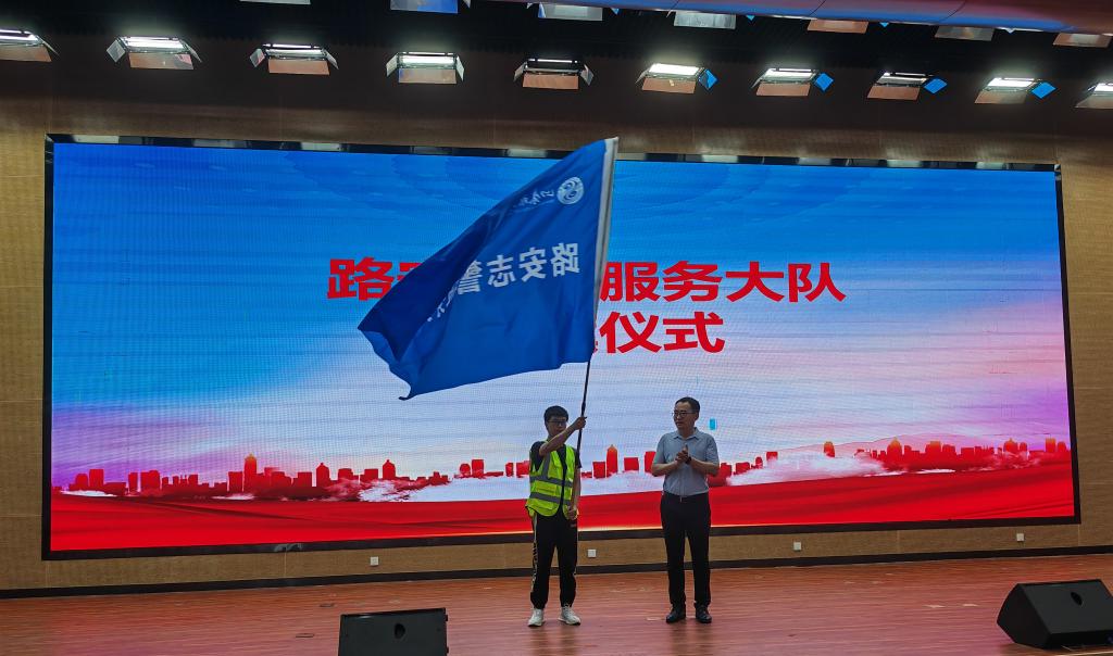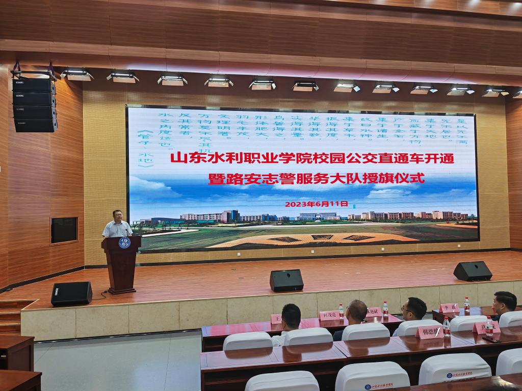 6月11日,学院在学术会议中心举行校园直通车开通暨路安志警服务大队授旗仪式。日照市交警支队党委委员、副支队长丁卫东,日照市交通运输局道路运输服务中心主任李政,日照市交警支队党委委员、直属大队大队长李斌,日照交通能源发展集团党委委员、副总经理何茂亮,日照大学科技发展集团总经理陈孝峰,学院党委委员、副院长林艳斌出席活动,交警支队直属大队、公交公司有关领导,学生工作处、总务处相关负责同志,各系部党总支副书记、2022级各班级班长、全体路安志警参加。