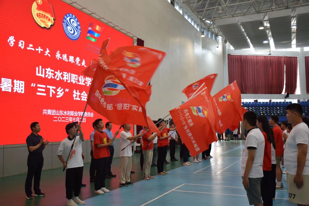 学生工作处团委和各系部相关负责人为暑期社会实践校级重点团队授旗。