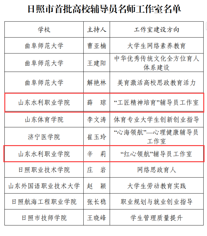 近日,中共日照市委教育工委公布了“日照市首批高校辅导员名师工作室”名单,学院薛琼老师主持的“工匠精神培育”辅导员工作室、辛莉老师主持的“红心领航”辅导员工作室获批。