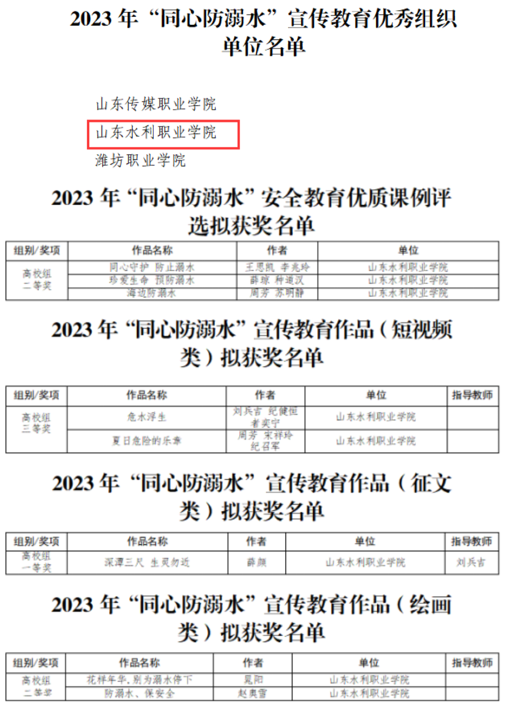 近日,山东省教育厅公示了2023年“同心防溺水”宣传教育优秀作品和安全教育优质课例评选结果,学院共获一等奖1项、二等奖5项、三等奖2项,并荣获“优秀组织单位”。