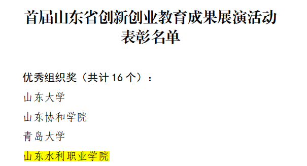 近日,山东省教育装备博览会组委会发布《关于公布2023山东省教育装备博览会表彰名单的通知》,学院荣获首届山东省创新创业教育成果展演活动“优秀组织奖”和“优秀展示奖”。