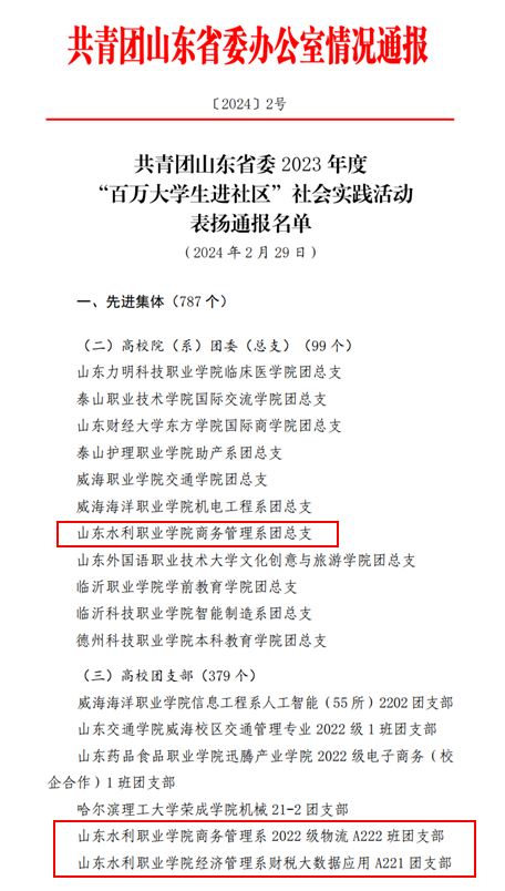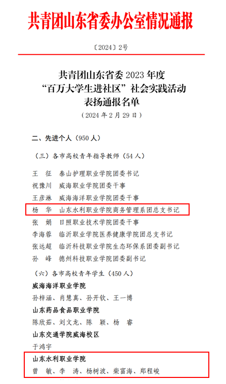 近日,共青团山东省委对2023年度“百万大学生进社区”社会实践活动中表现突出的先进集体、先进个人和示范项目进行表扬通报。学院商务管理系团总支、商务管理系2022级物流A222班团支部、经济管理系财税大数据应用A221团支部获评“先进集体”,杨华、曾敏等6位师生获评“先进个人”。